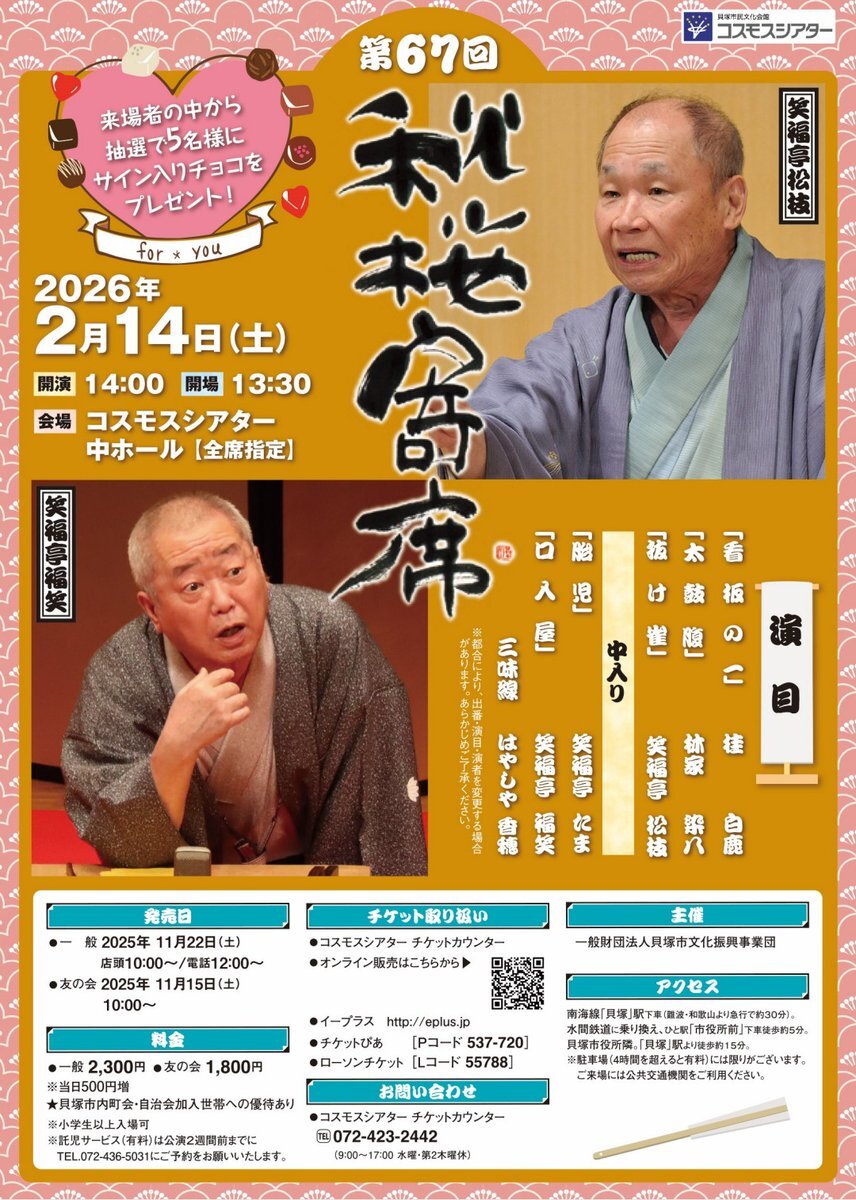 「第67回秋桜寄席」 〈日時〉2026.2/14(土) 14:00開演 〈会場〉#コスモスシアター 中ホール 〈出演〉#笑福亭福笑 #笑福亭松枝 #笑福亭たま #林家染八 #桂白鹿 (三味線) #はやしや香穂 〈料金〉一般 前売 2300円 当日 2800円 ★一般前売11/22(土)発売 #落語 #貝塚市 pic.x.com/vDw7S8H4bD