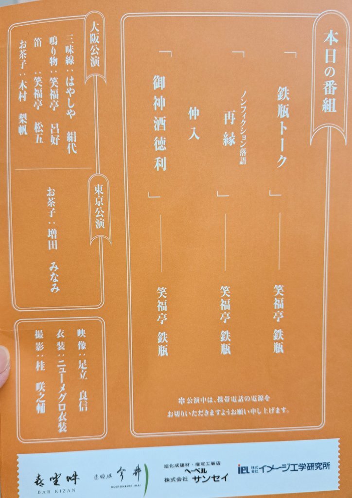 昨夜は、今 上方落語界で最も勢いのある先輩🔥の独演会の動画撮影を担当。打ち上げにも参加させて頂きました‼️オープニングの鉄瓶トークから始まり、ノンフィクション落語、古典落語と続く三部構成。約2時間、一人でしゃべりっぱなしの熱演に圧倒されました👏 #笑福亭鉄瓶独演会 pic.x.com/kqFBsKkbez