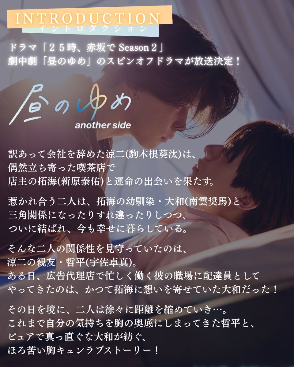 #ドラマ25時赤坂で Season2 『昼のゆめ another side』イントロダクション🫧 完全オリジナルストーリーでお届けする、 劇中劇「#昼のゆめ」のスピンオフドラマ🎞️ˊ˗ ぜひご覧ください✨ 🌃12月10日(水)深夜1時(25時)~放送 #駒木根葵汰 #新原泰佑 #宇佐卓真 #南雲奨馬 / #広木健太 #笠松七海 pic.x.com/0FVlv5eVy4