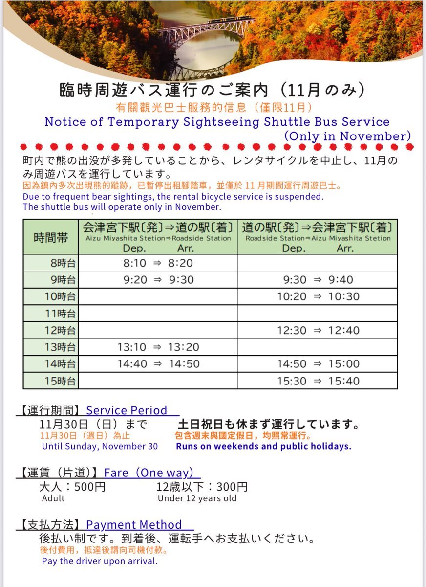〜臨時周遊バス運行のご案内〜 〔区間〕会津宮下駅↔︎道の駅尾瀬街道みしま宿 〔期間〕11月中 🔍臨時バス運行について🚌 town.mishima.fukushima.jp/site/kankou/66… #第一只見川橋梁 #紅葉シーズン #クマ遭遇注意 #クマ出没注意 #サル出没注意 #三島町観光協会 #レンタサイクル中止 #山中ファーム #緊急対応 pic.x.com/WmN1PlKlpo