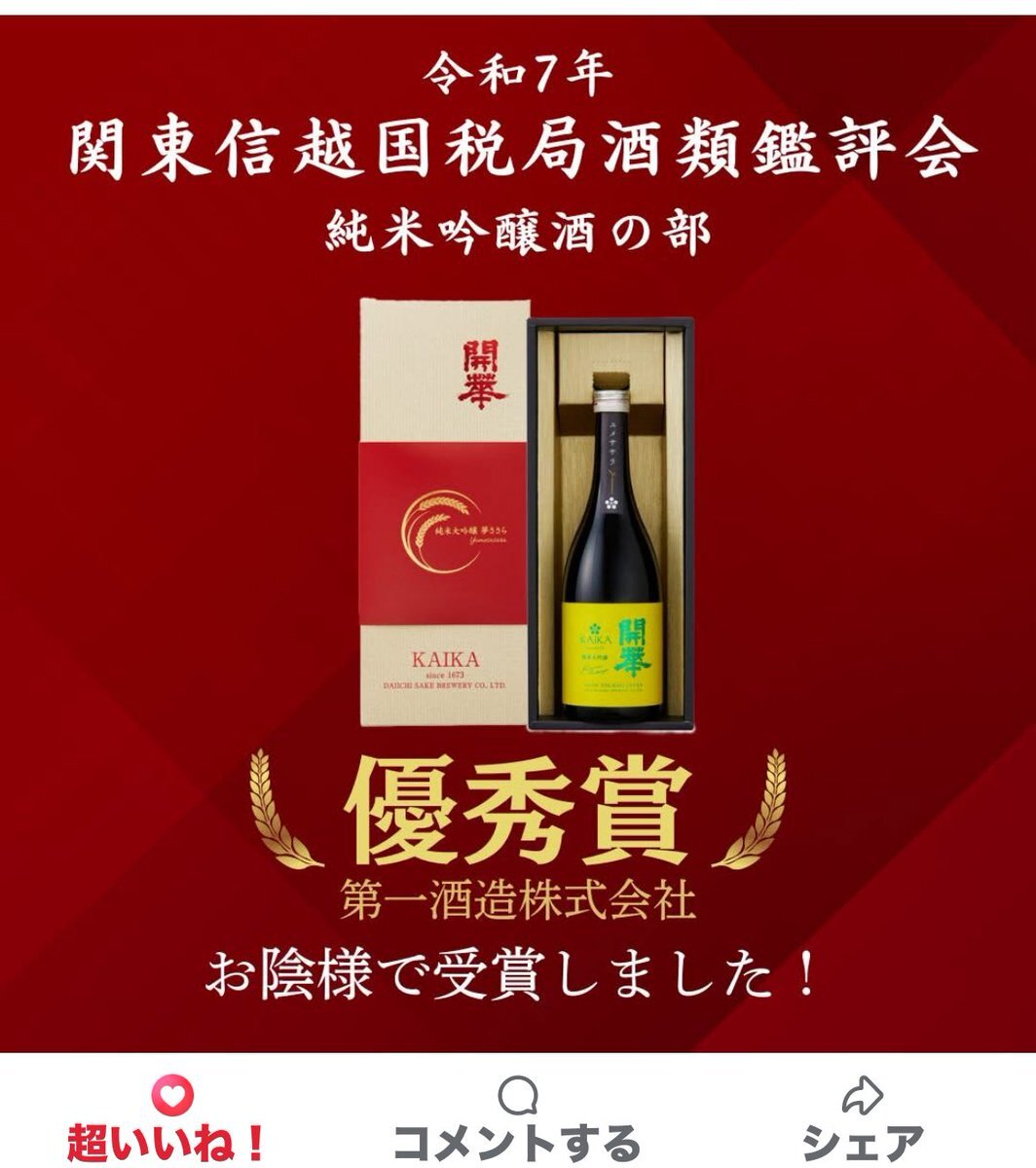 【ご報告】第96回関東信越国税局酒類鑑評会にて、弊社は純米吟醸の部で優秀賞をいただきました! 来年も賞を頂けるよう、今期の仕込みも精一杯頑張りたいと思います🙇‍♂️ #開華 #第一酒造 #関東信越国税局酒類鑑評会 #優秀賞 #開華純米大吟醸夢ささら