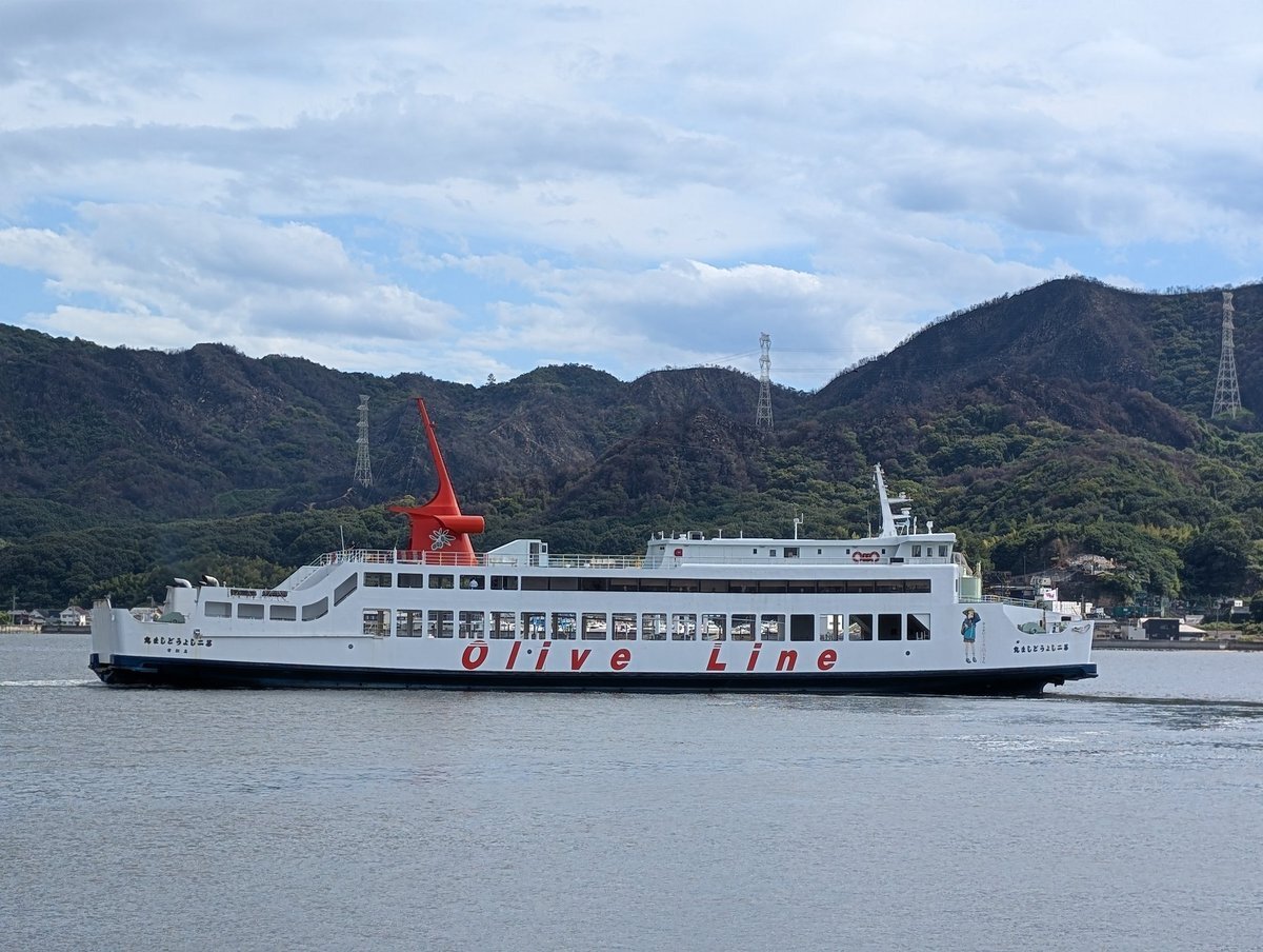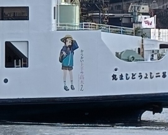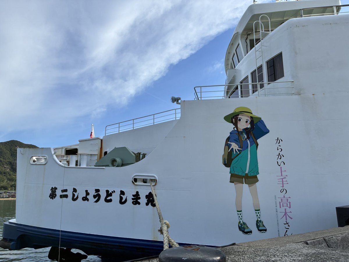 新岡山港から小豆島行きのフェリーに「からかい上手の高木さん」 聖地巡礼の集客のためなんでしょうね 港に着いたのが出港直後で間一髪、方向転換中に何とか見ることできた 息子が大好きなマンガ、ビックリしてたが大喜びでした😊 #からかい上手の高木さん #聖地巡礼 #新岡山港 #第二しょうどしま丸 pic.x.com/NwgastOOtc