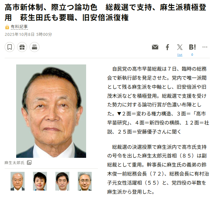 高市早苗に早くも失望感── 発表された自民党執行部の顔ぶれを見ると、茂木が喜び、旧安倍派が喜び、そして麻生太郎が一番喜んでいるのが分かる。 高市が総理になったとして閣僚人事はこの路線だろう。 ──高市早苗で日本は良くならない。 ”老害” 麻生太郎を肥え太らせるだけである。