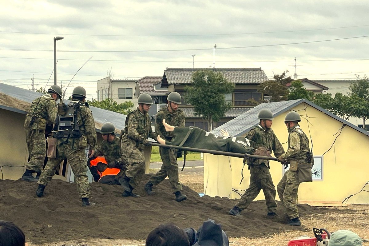 #第34普通科連隊 は焼津市及び藤枝市で行われた #静岡県総合防災訓練 に参加しました。 大規地震を想定した内容で訓練が行われ、連隊は倒壊家屋からの負傷者の救出・救助、ヘリ誘導、カレーの炊き出し及び装備品展示を行い、各関係機関との連携強化と防災意識の高揚を図りました。 #板妻駐屯地 #34i pic.x.com/doeLxPVqz0