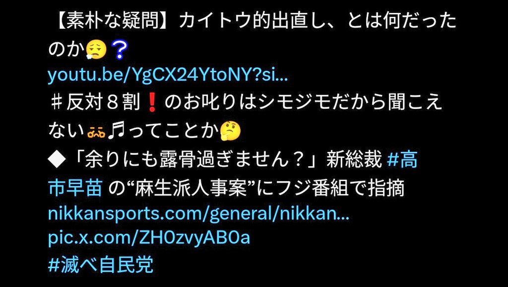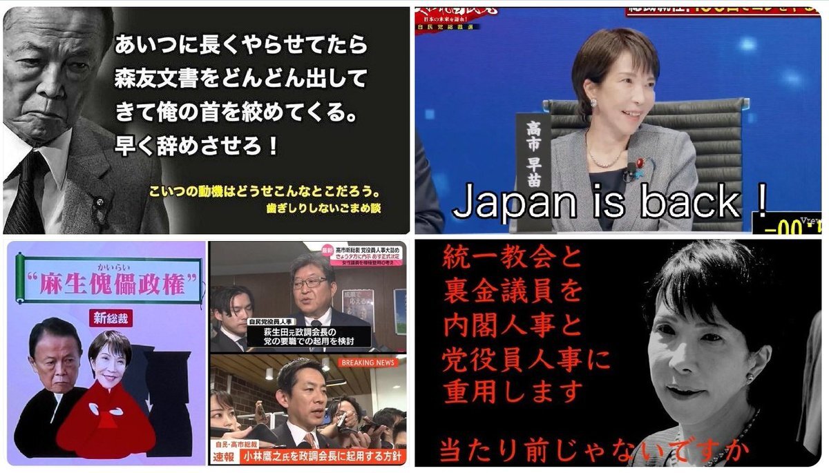 「第2次麻生政権」がトレンド入り。高市早苗総裁の人事にSNSで批判殺到。「旧態政治」の声広がる。 #高市早苗 #麻生太郎 #自民党 #第2次麻生政権 賛成❓反対❓ この政治家の対応に、あなたの評価は❓ 今すぐ👍 or 👎で投票を politician.cafe/politician/26/…