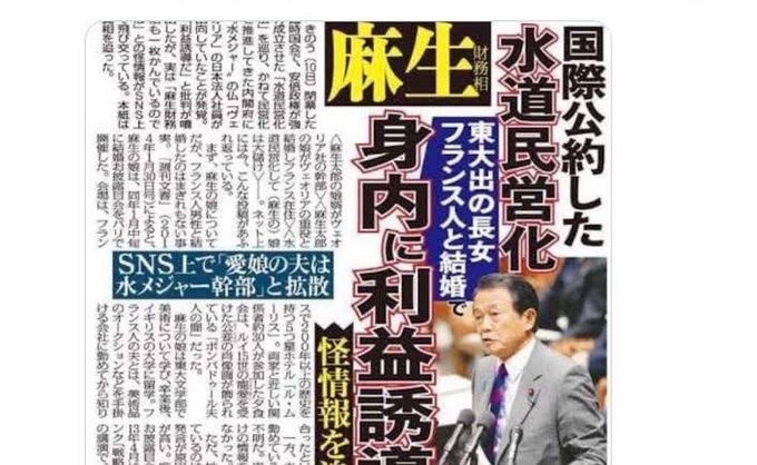 水や火葬場を売り飛ばした売国奴。 これまで国民生活や福利など、一度だって考えたこともないんだろう。 「自称愛国保守様」たちはどうしてこの売国行為に騒がないのか? #麻生太郎 #第2次麻生政権 pic.x.com/XyIHJSO8kd