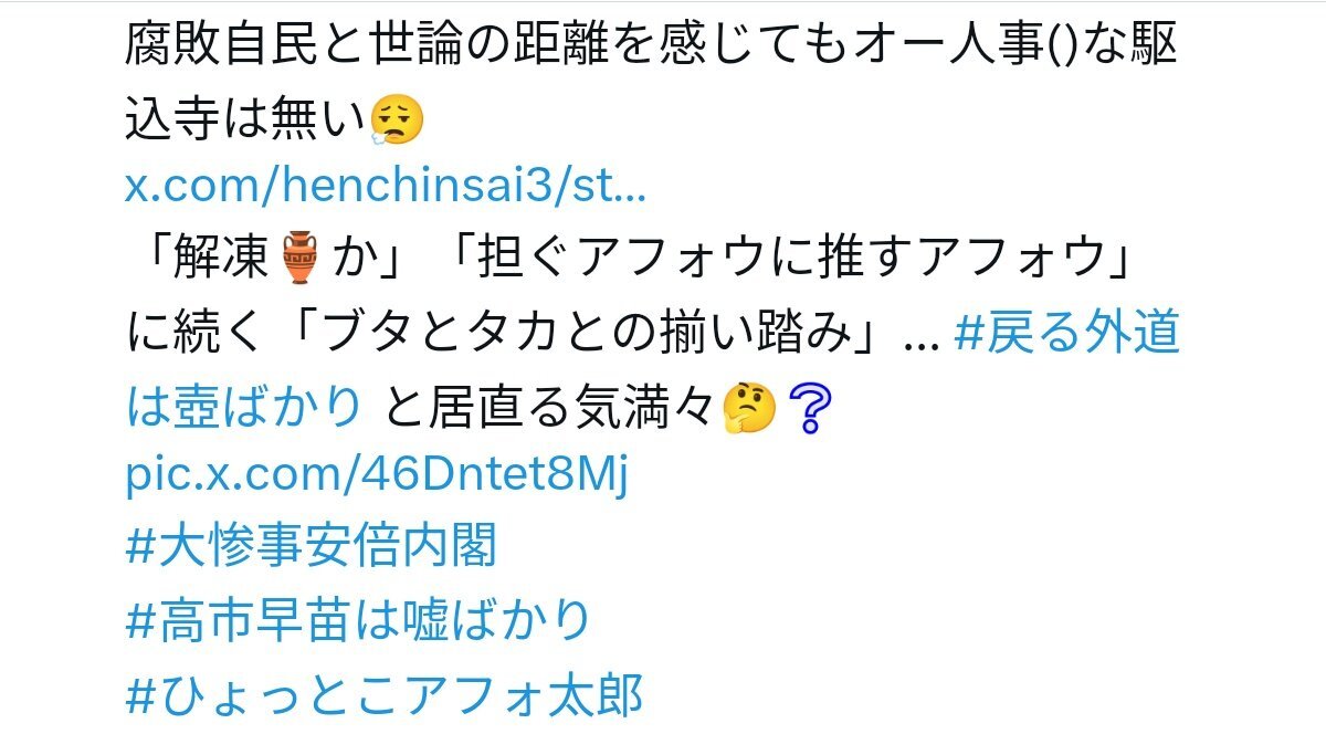 腐敗自民と世論の距離を感じてもオー人事()な駆込寺は無い😮‍💨 x.com/henchinsai3/st… 「解凍🏺か」「担ぐアフォウに推すアフォウ」に続く「ブタとタカとの揃い踏み」... #戻る外道は壺ばかり と居直る気満々🤔❔ x.com/shinyaman2/sta… #大惨事安倍内閣 #高市早苗は嘘ばかり #ひょっとこアフォ太郎