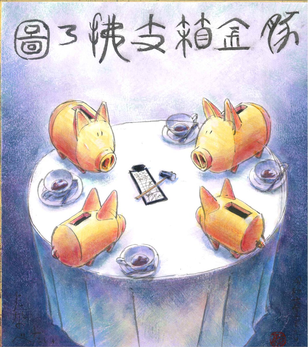 R7年度チャリティー出品作品紹介 №635「豚金箱支払乃図」「#たなべたい 様」(漫画家 日本漫画家協会) #富山県善意銀行 #第63回善意色紙等頒布展 (令和7年12月5日~7日)にご協力いただきました。一番高い希望価格の方にお譲りします。詳細はHPを toyamazengin.com pic.x.com/72F9y0A4MG