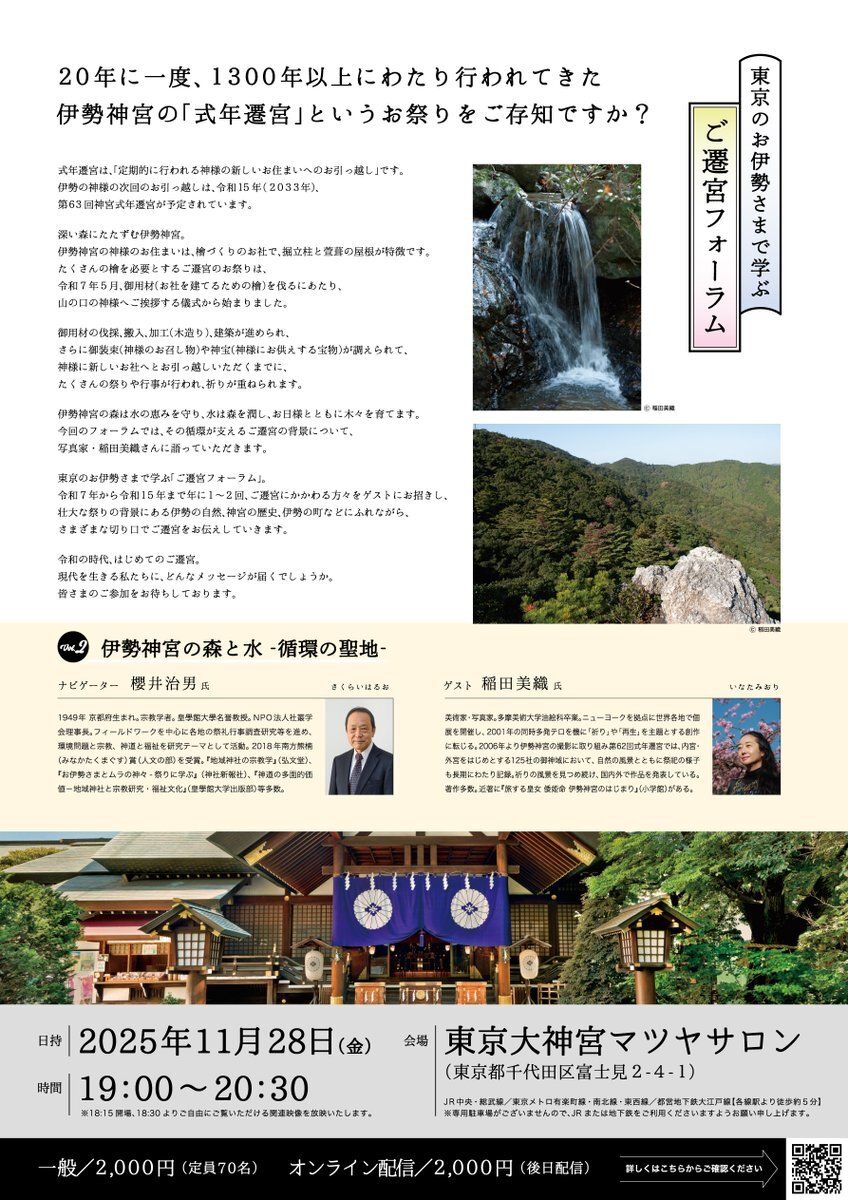 【東京のお伊勢さまで学ぶ ご遷宮フォーラム】 Vol.2 伊勢神宮の森と水-循環の聖地- * 日時:令和7年11月28日(金)19:00~20:30 会場:東京大神宮マツヤサロン 参加費:2,000円(定員70名)*オンライン配信(後日配信)2,000円 #伊勢神宮 #式年遷宮 #ご遷宮 #第63回神宮式年遷宮 #稲田美織 pic.x.com/lNIM3Ahtcb