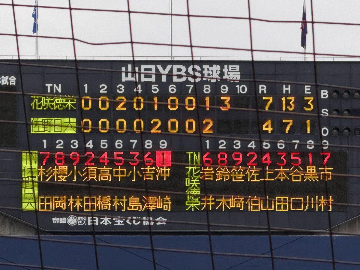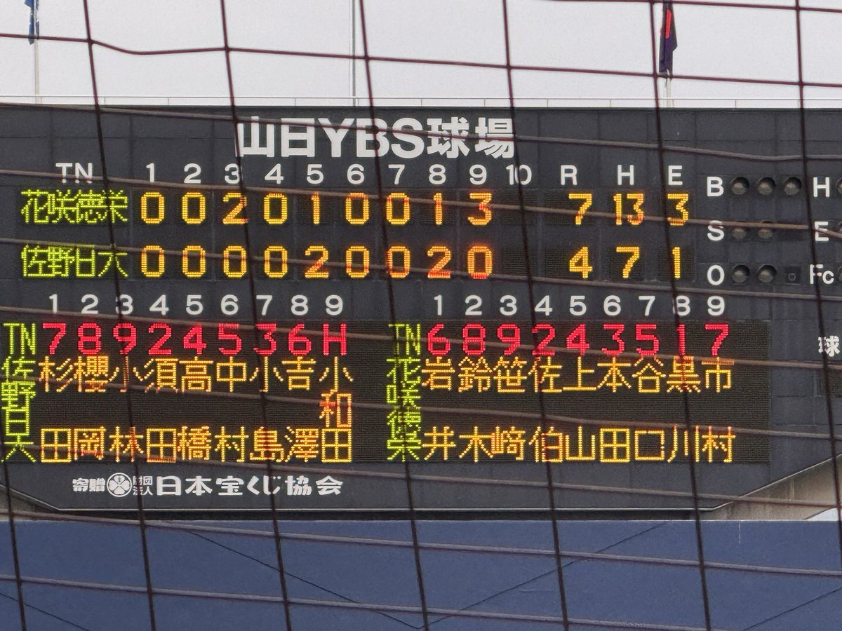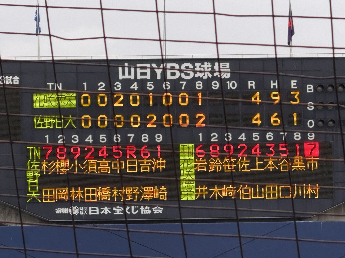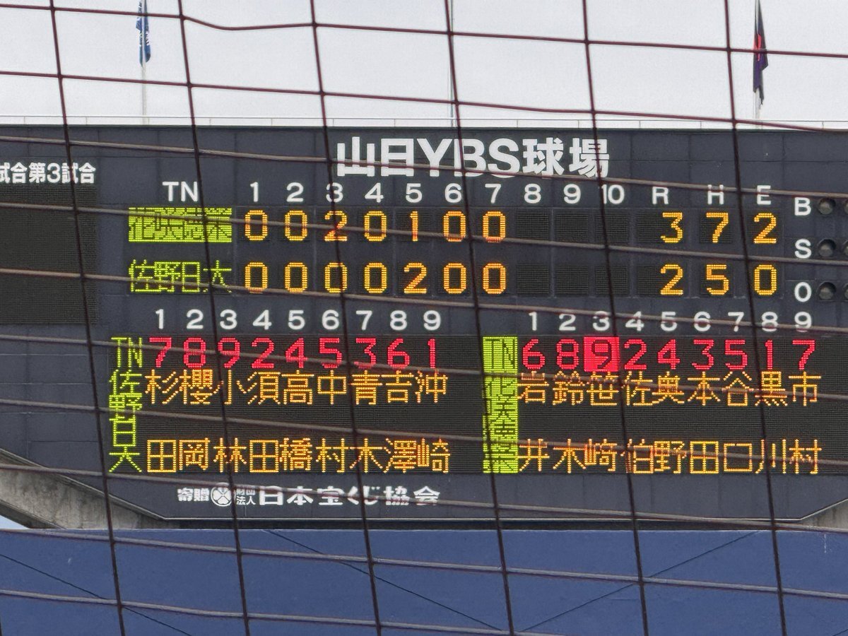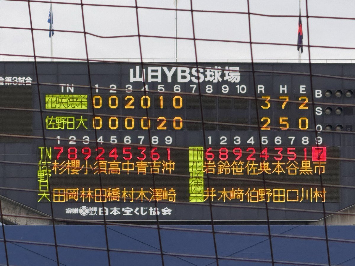 #第78回秋季関東高校野球大会 ○山日YBS球場 【準決勝】 第2試合 7回終了 花咲徳栄(埼玉1位)3ー2佐野日大(栃木1位) 7回は両チームとも三者凡退で攻撃を終える #高校野球 #関東大会 pic.x.com/qUYTGoC3JZ