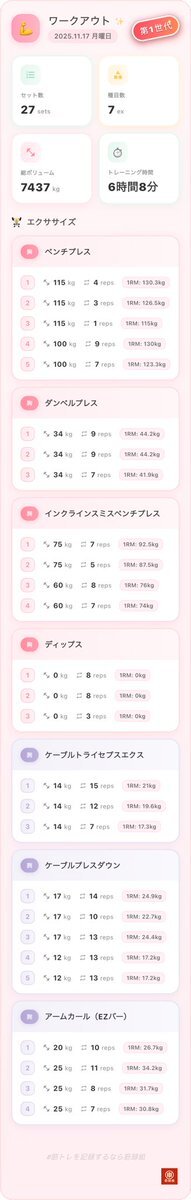 今日は胸。今年101日目。 今日はおでかけしてランチ食べたり、ケーキ食べたりな日。 満足度高し。 カロリー摂取した分、ちゃんと運動もしましょう、ということでちゃんとやりました。 #筋トレを記録するなら筋録組 #筋録組 kinrokugumi.com/?dm pic.x.com/8LZ6naRXRk