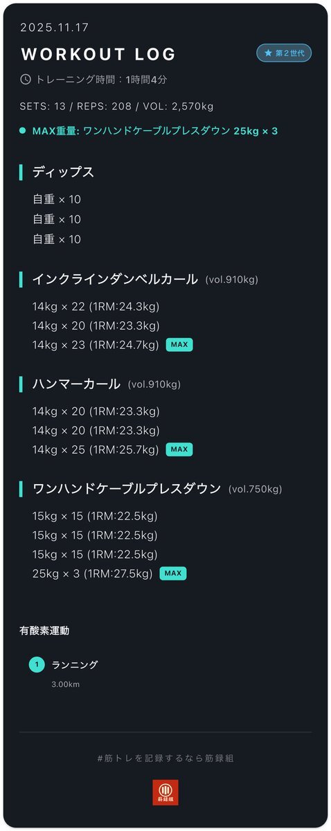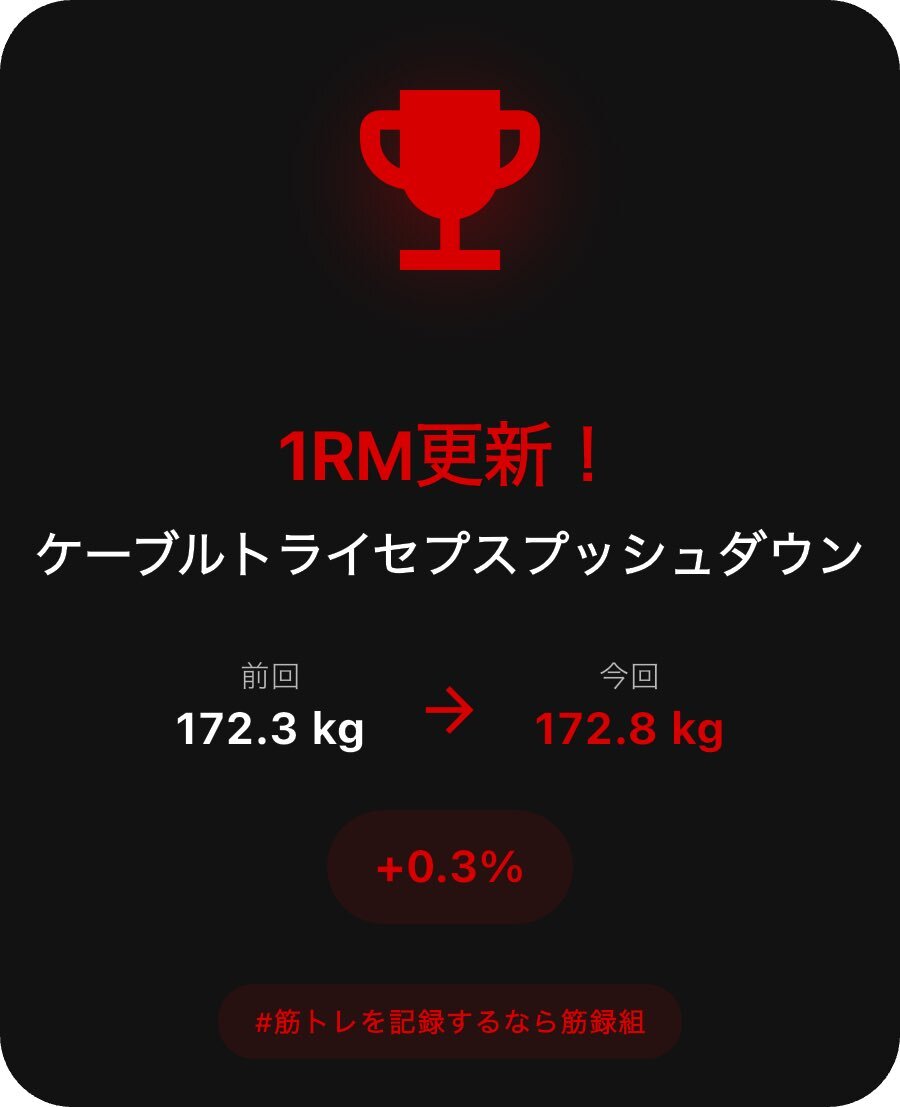 ケーブルトライセプスプッシュダウンで新記録達成! 172.3kg → 172.8kg #筋トレを記録するなら筋録組 #筋録組 kinrokugumi.com/?ac pic.x.com/r7AtTei3F5