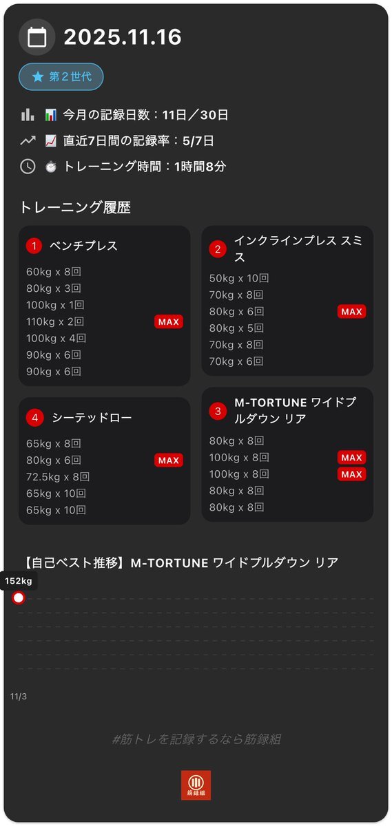 #筋トレを記録するなら筋録組 #筋録組 kinrokugumi.com/?da 疲労が溜まっている🫠 今週も週5は確保できた☺️ このアプリ良すぎて無料で使わせてもらってるの申し訳ない😅 pic.x.com/l7K3lFahCC