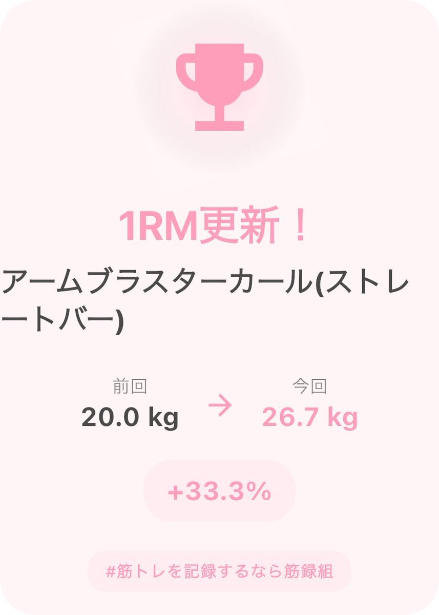 肘痛てー 無理しない範囲で頑張る😤 アームブラスターカール(ストレートバー)で新記録達成! 20.0kg → 26.7kg #筋トレを記録するなら筋録組 #筋録組 kinrokugumi.com/?ac pic.x.com/YUhbOGp6WD