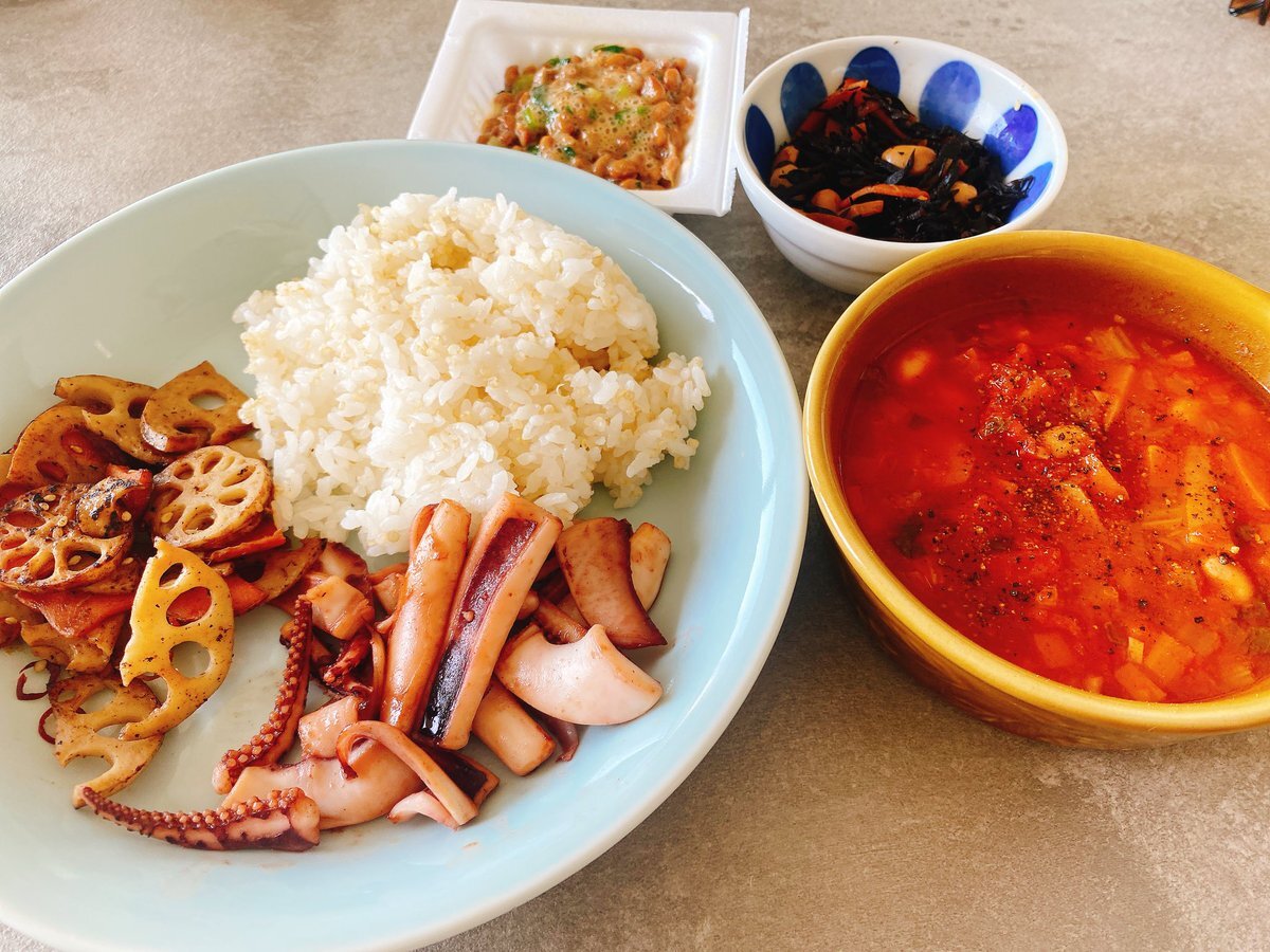 今日のお昼ごはん🍚 イカの燻製しょうゆいため、蓮根のきんぴら、ひじき、納豆、ミネストローネ 521kcal(タンパク質22.8g、脂質12.4g、炭水化物85.4g) #料理好きな人と繋がりたい #筋トレ垢さんと繋がりたい #ダイエット垢さんと繋がりたい pic.x.com/U9LyAD8dDU