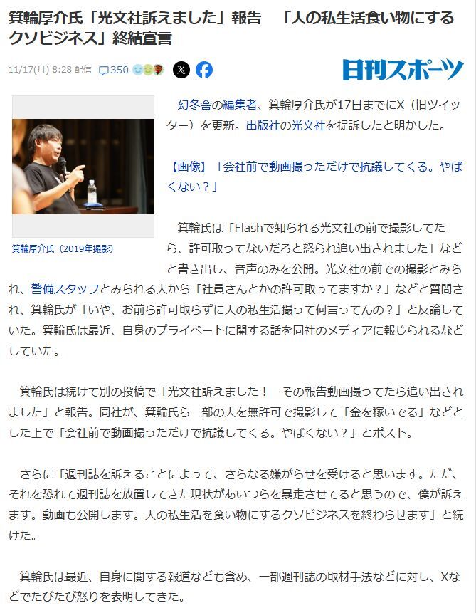 この訴訟により、僕は週刊誌から狙われ、あることないこと書かれると思います! ただ当たり前のようにプライバシー侵害をして金儲けし、最悪の場合は自殺にまで追い込む週刊誌の問題を世に問いたいので訴えます。 可能な範囲で拡散やカンパで応援してもらえると嬉しいです! x.com/minowanowa/sta…