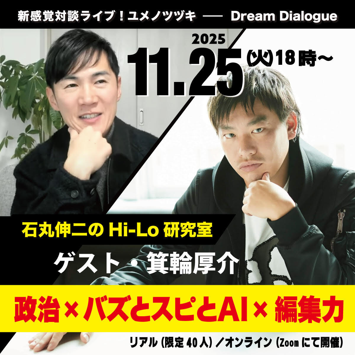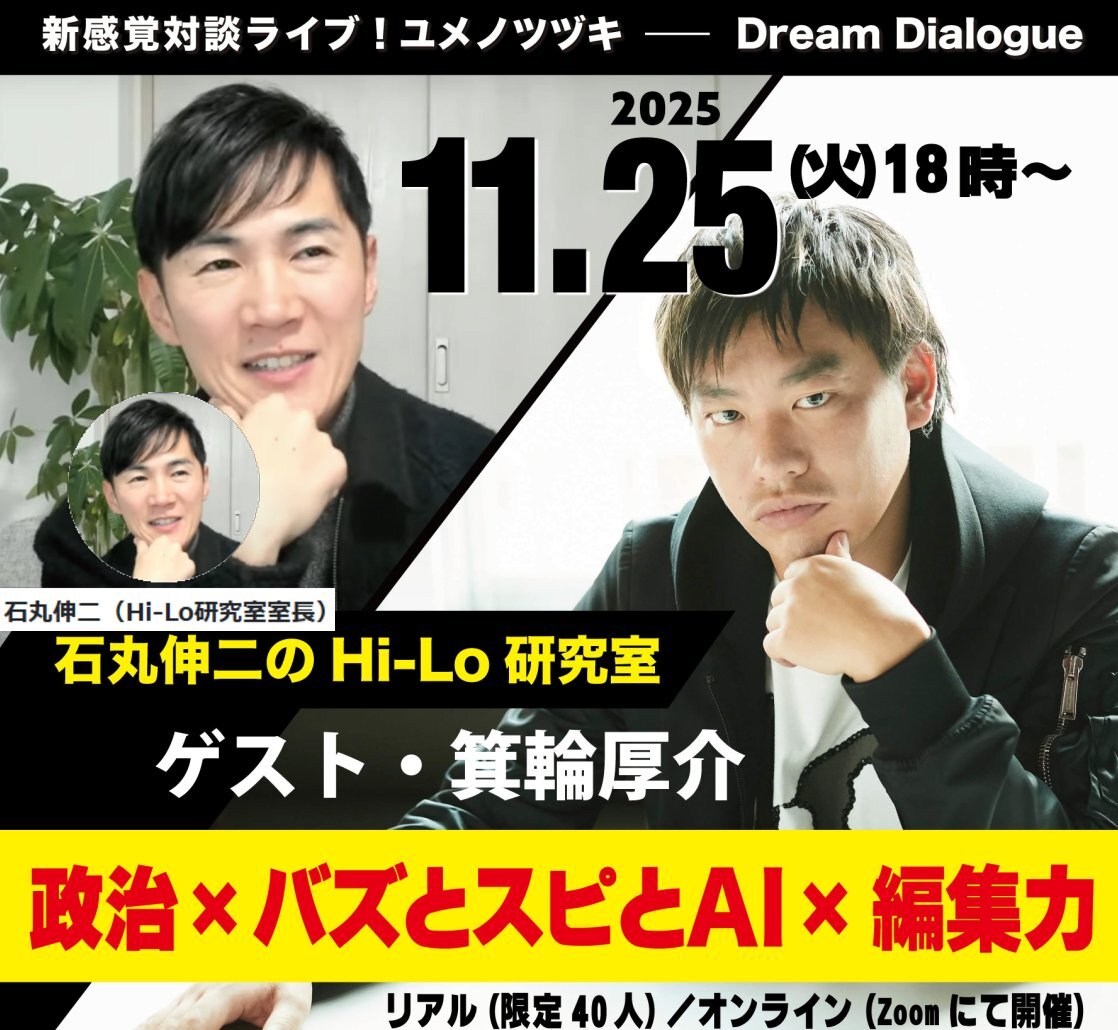 リアル(限定40人)/オンライン(Zoom開催)石丸室長と箕輪さんの対談なんて絶対おもしろいよね😁 #石丸伸二 #箕輪厚介 緊急対談!2025年11月25日開催【石丸伸二のHi-Lo研究室 :ゲスト・箕輪厚介】政治・メディア・SNS・AI・出版・ビジネスについてガチ分析!> yakan-hiko.com/meeting/yumeno… #石丸伸二