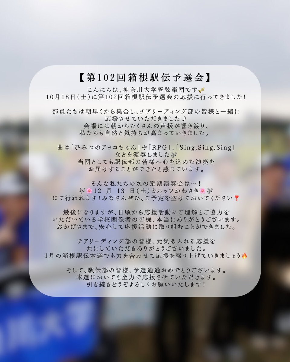 【第102回箱根駅伝予選会】 こんにちは、神奈川大学管弦楽団です🎺 10月18日(土)に開催された第102回箱根駅伝予選会の応援に行ってきました! #神奈川大学 #管弦楽団 #箱根駅伝予選会 pic.x.com/X4exbsuWoI