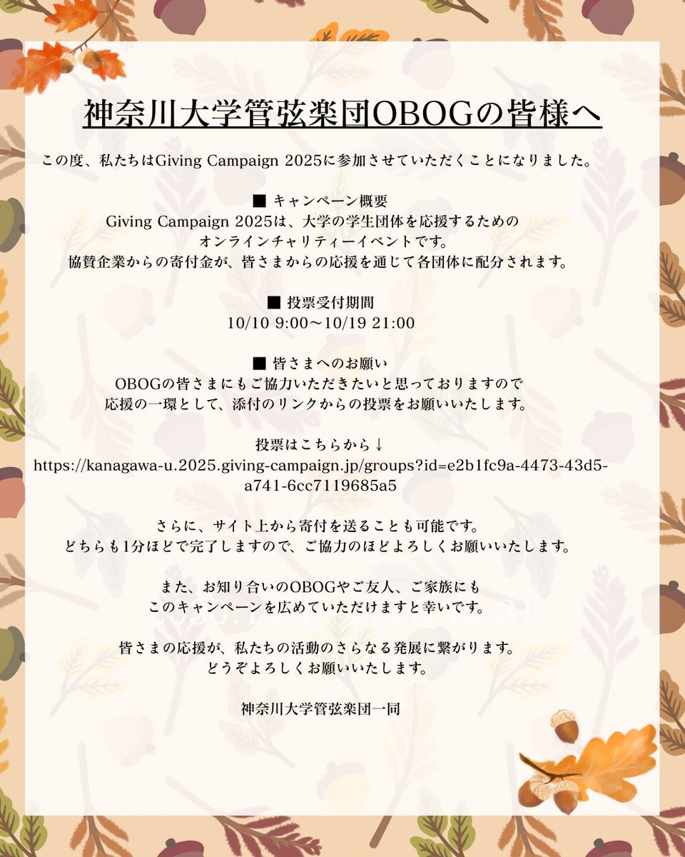 【GivingCampaign2025】 当団卒団生への方へご連絡です。 ご協力のほどよろしくお願いいたします🙇 投票はこちらから↓ kanagawa-u.2025.giving-campaign.jp/groups?id=e2b1… #givingcampaign2025 #神奈川大学 #管弦楽団 #神大オケ pic.x.com/HTsrYXNN7E