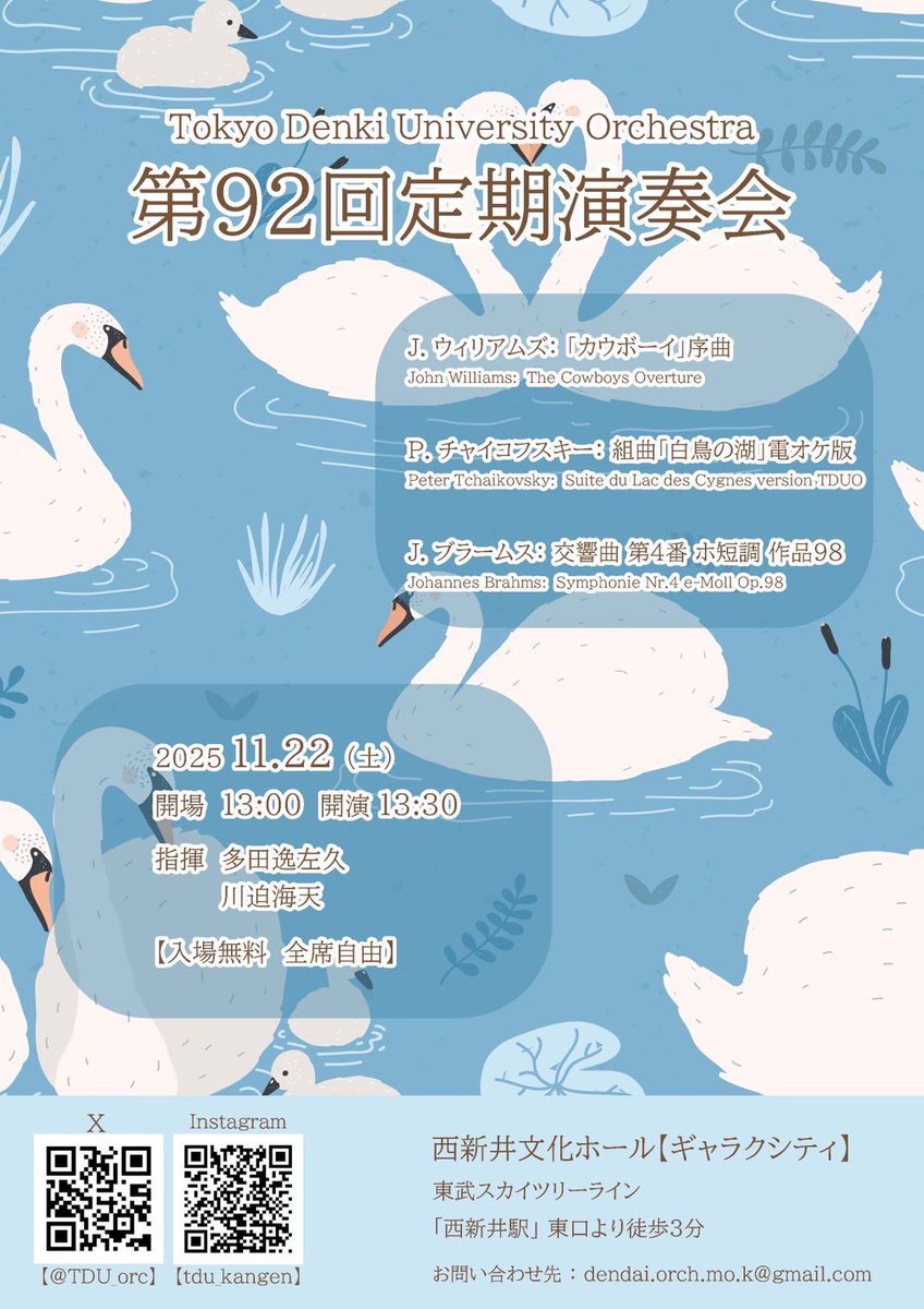 第92回定期演奏会のお知らせ📢 11/22(土) 西新井文化ホール(ギャラクシティ) 13:00開場/13:30開演 🎼曲目 ウィリアムズ / 「カウボーイ」序曲 チャイコフスキー / 組曲「白鳥の湖」電オケ版 ブラームス / 交響曲第4番 ホ長調 作品98 入場無料です! 是非お越しください!!