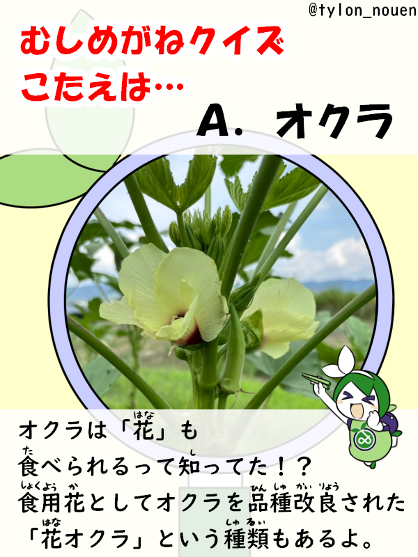 【#むしめがねクイズ】答え。 オクラって花も食べられるんだって! Σ(・□・;)知らなかったぁ…!! #オクラ は成長スピードが非常に速い野菜です。 ふと目を離した隙にすぐに大きくなりすぎて硬くなって味が落ちるのです…💦 朝の涼しいうちが収穫のスピード勝負なのです! #タイロンのうえん