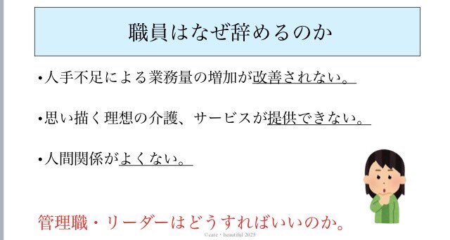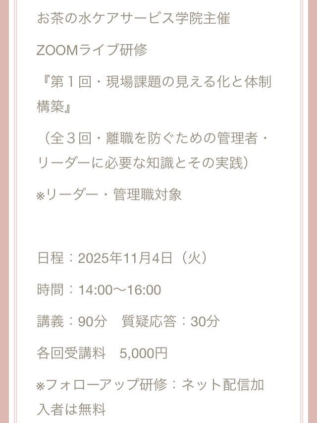 ⁡お茶の水ケア専門学院主催 第1回 11月4日(火) 『現場課題の見える化と体制構築』 ⁡ 第2回 12月3日(水)『個別性の高い職員に対する指導・関わり方』 ⁡ 第3回 2026年1月13日(火)『新入職員(未経験者・経験者)の教育計画と指導法』 ⁡ 💻✨お待ちしています! care-beautiful-smile.amebaownd.com/posts/57637255/