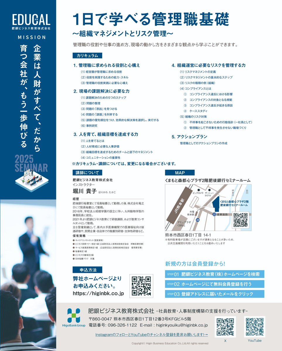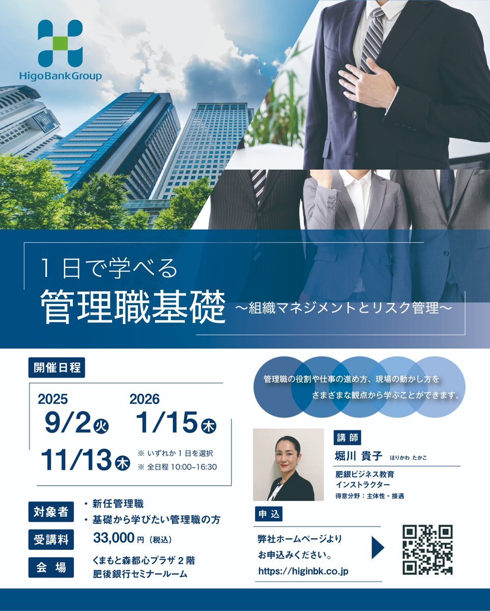 📢\ #管理職 の基礎を学びたい方必見 / ✅管理職としての役割 ✅現場の課題解決力 ✅組織運営のスキル を身につけます! 前回参加できなかった方もぜひお申込ください! お申込はこちら▶higinbk.co.jp/seminars/1433 #肥銀ビジネス教育 #熊本の人事 #セミナー情報 pic.x.com/0sgcLmq2IP