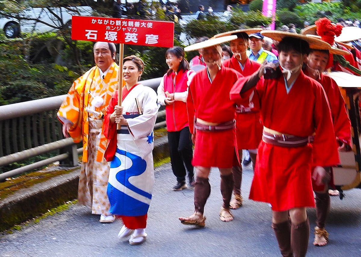 【箱根大名行列】 文化の日に箱根湯本で行われた「箱根大名行列」 今回は「かながわ観光親善大使」の石塚英彦さんがゲストとして参列し「まいう~」「箱根に来てね!」と呼び掛けていました #箱根大名行列 #かながわ観光親善大使 #ホンジャマカ #石塚英彦 #まいう~ #箱根に来てね #芸妓きらり妓 pic.x.com/w3TmRpSzXG