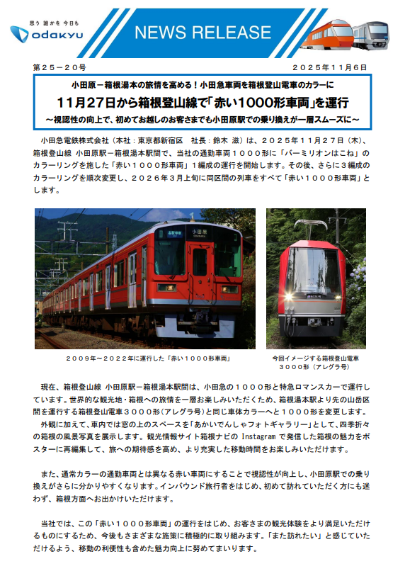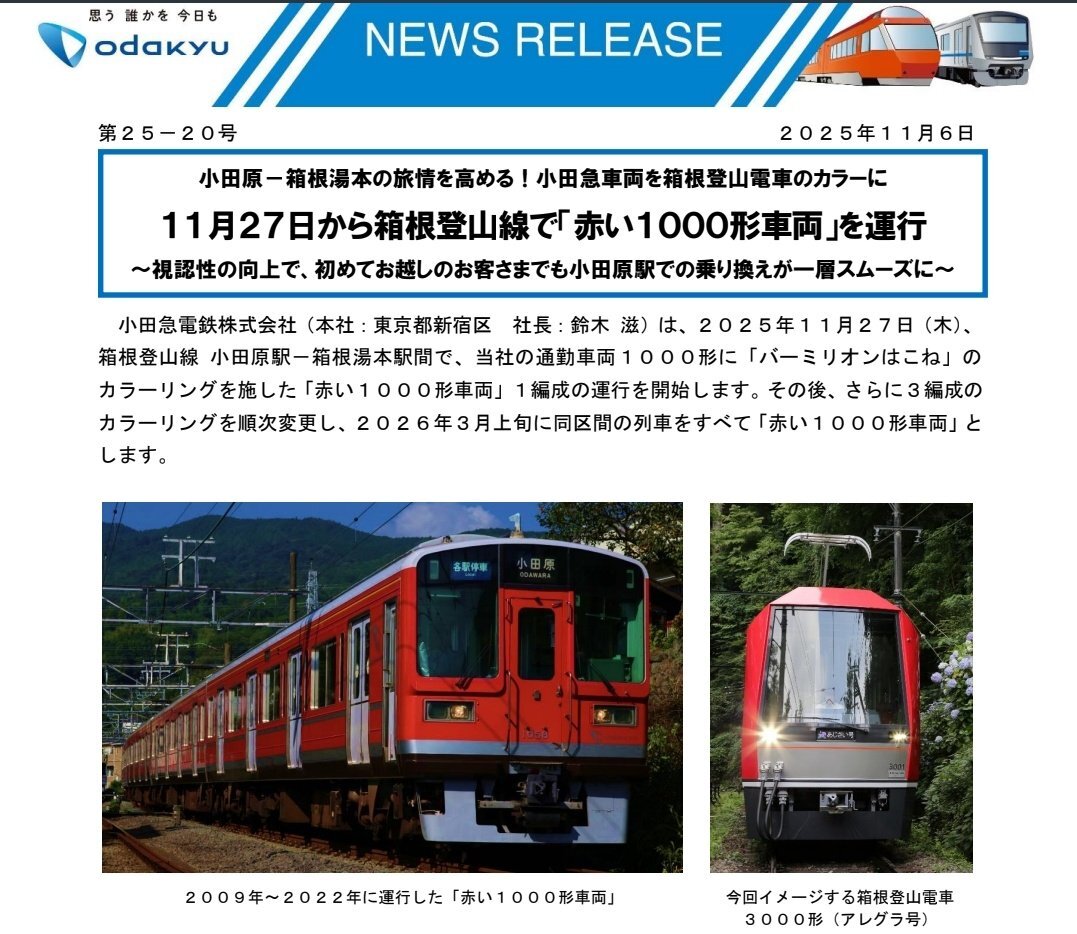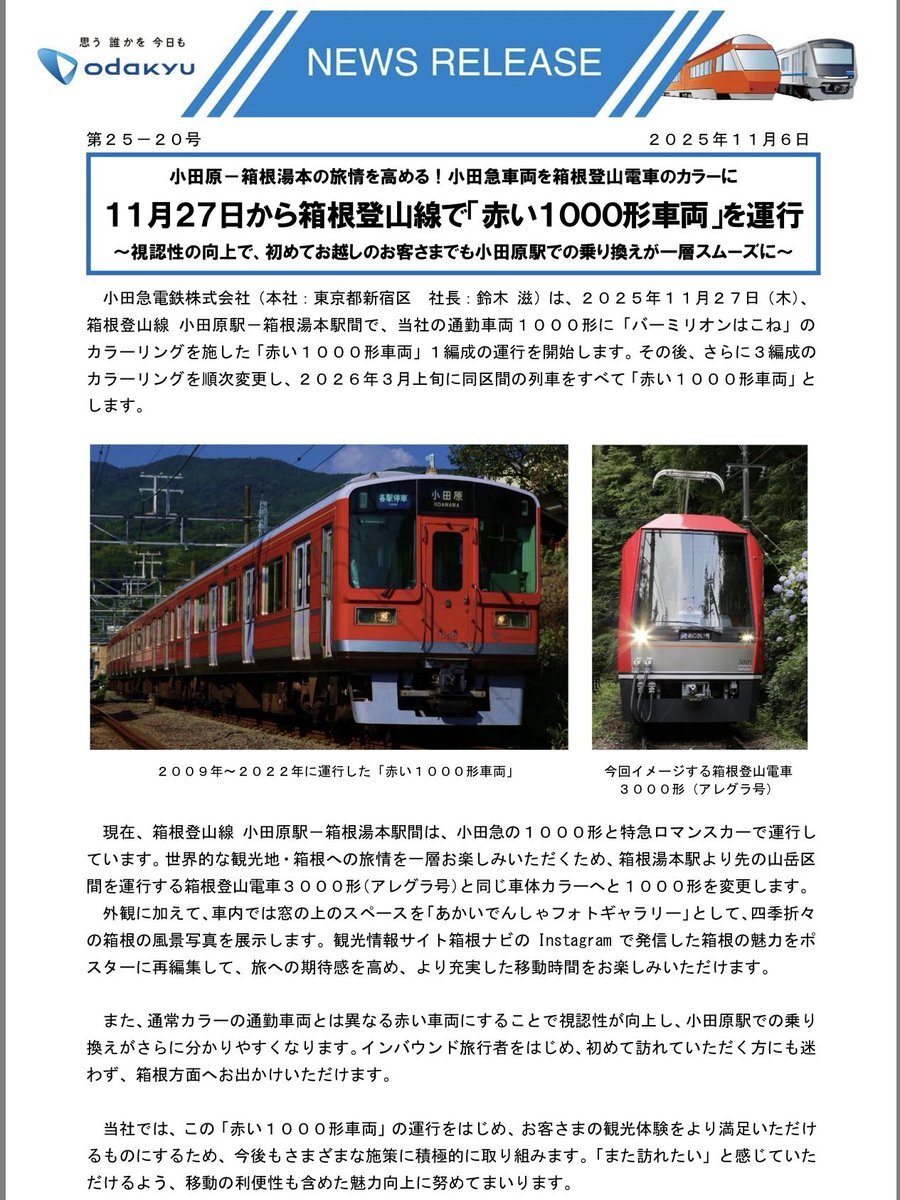 11月27日から #箱根登山線 「#赤い1000形車両」を運行 pic.x.com/qADe50KOUR x.com/HakoneTozanlov…