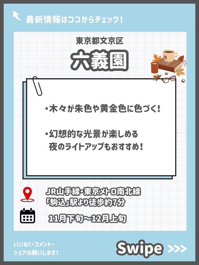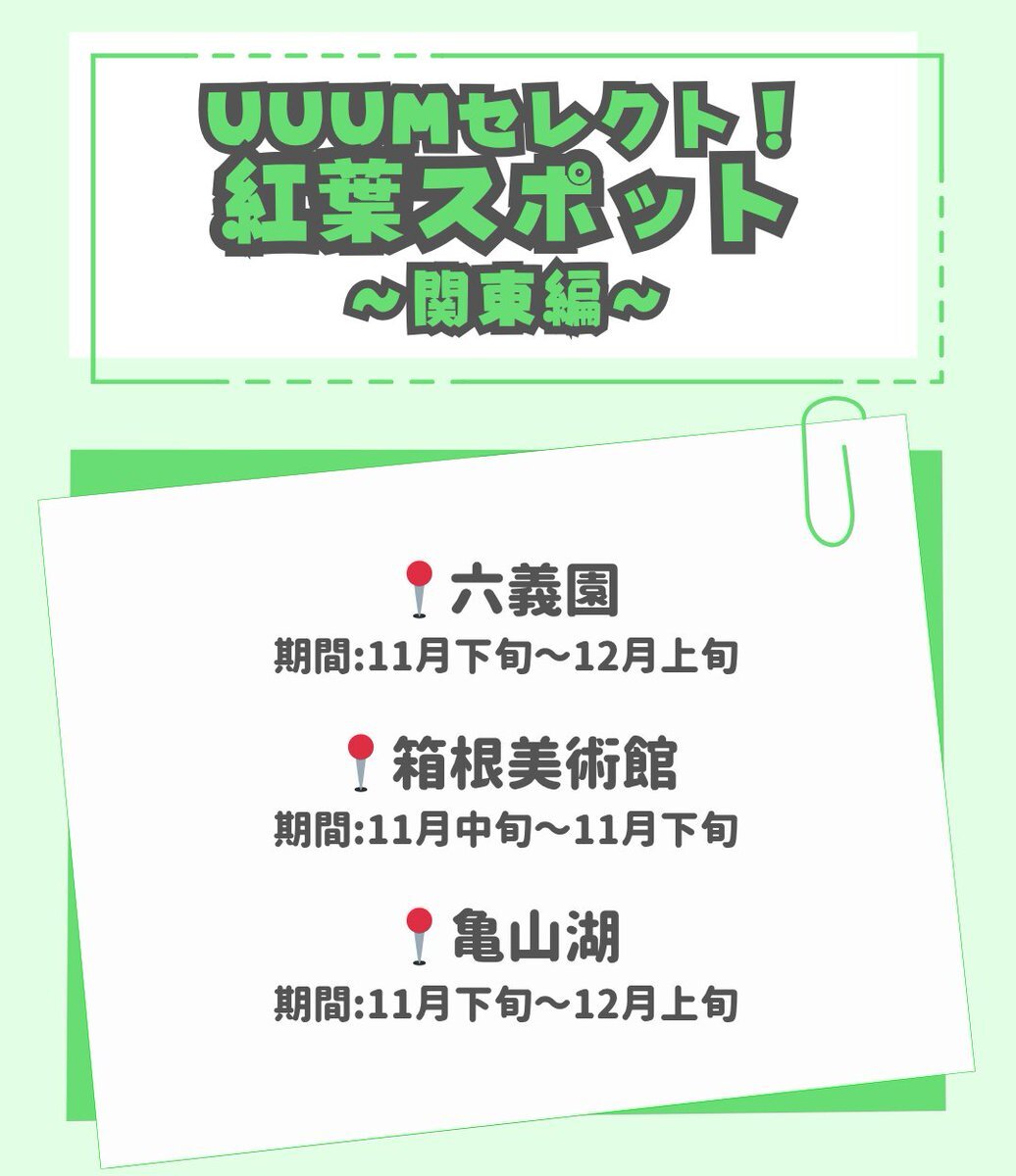 紅葉スポット3選~関東編~🍁 📍六義園 見頃:11月下旬〜12月上旬 朱色や黄金色に色づく庭園。幻想的な夜のライトアップがおすすめ! 📍箱根美術館 見頃:11月中旬〜11月下旬 陶磁器の展示が楽しめる美術館。130種類の苔と真っ赤な200本のモミジが織りなす美しさは格別! 📍亀山湖