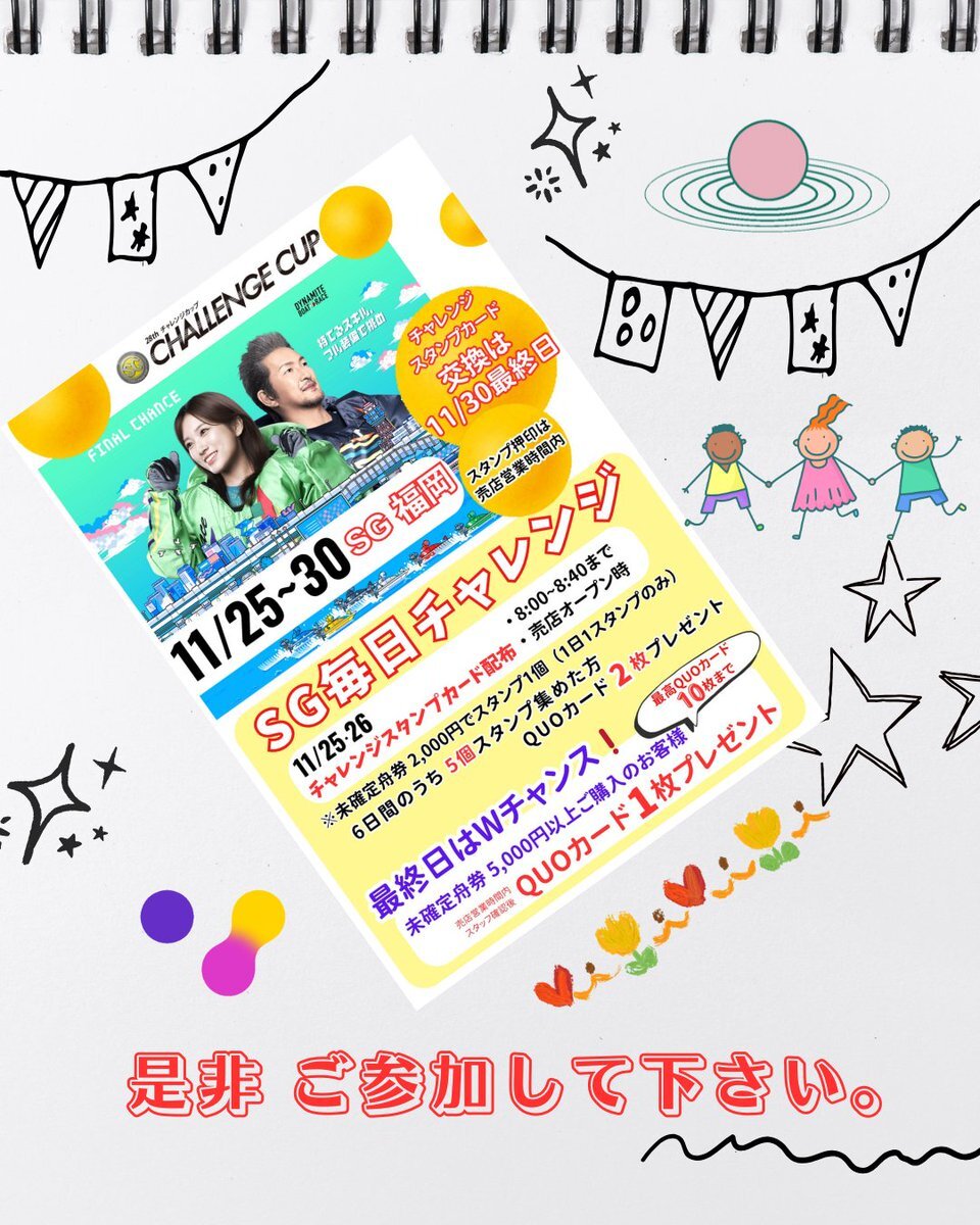 オラレ美馬 元気にオープンしております。昨日から、#福岡競艇場 SGチャレンジカップが始まっており今日は、2日目となっております。🚩12レースの出場選手🚩1️⃣号艇 #芽原悠紀 2️⃣号艇 #篠崎元志 3️⃣号艇 #片岡雅裕 4️⃣号艇 #池田浩二 5️⃣号艇 #原田幸哉 6️⃣号艇 #関浩哉🎉SG開催イベント開催中🎁 pic.x.com/snxa1nxocr