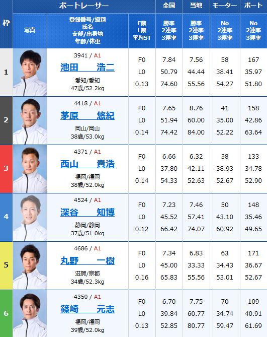 【#ボートレース福岡 ・ #チャレンジカップ 】選考順位1位の池田浩二選手が1号艇で登場! ◆初日12R・ドリーム戦 ①#池田浩二(愛知) ②#茅原悠紀(岡山) ③#末永和也(佐賀) ④#桐生順平(埼玉) ⑤#馬場貴也(滋賀) ⑥#西山貴浩(福岡)