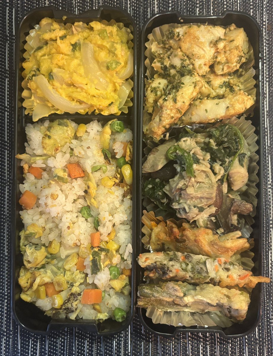 10/29おべんと ・鶏むね肉のバターソース焼き ・ほうれん草ときのこのガーリックバターソテー ・ごぼう、人参、いんげん、塩昆布の天ぷら ・かぼちゃのマヨサラダ ご飯は炒飯で。👍 #料理男子 #弁当男子 #あっきーくっきんぐ #料理好きな人と繋がりたい #簡単弁当 #弁当記録