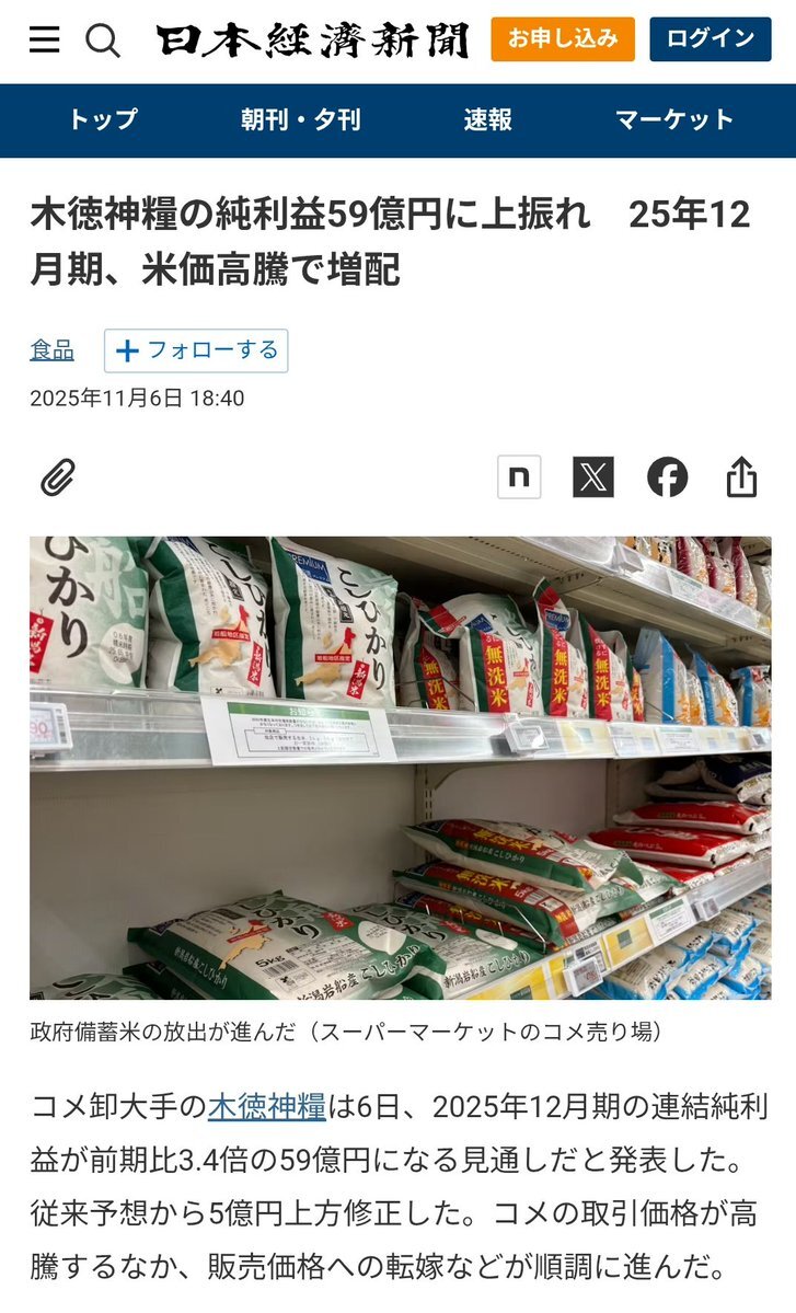 決算:木徳神糧の純利益59億円に上振れ 25年12月期、米価高騰で増配 - 日本経済新聞 nikkei.com/article/DGXZQO… >コメ卸大手の木徳神糧は6日、2025年12月期の連結純利益が前期比3.4倍の59億円になる見通しだと発表した。 #米の先物取引 米の先物取引 #高市早苗 高市早苗 #鈴木憲和 鈴木憲和 pic.x.com/8HIBip04v2 x.com/norikazu_0130/…