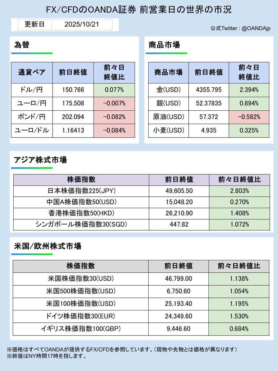 📈 2025年10月21日の主な経済指標 📉 20:00(EU)ラガルドECB総裁、発言 21:30(加)9月消費者物価指数(CPI) #OANDA #FX #ドル円 #ユーロ #ゴールド #経済指標 #日経平均株価 #トランプ米大統領 #トランプ関税 #高市 #米雇用統計 #為替 #fx #資産運用 #市況 #CFD pic.x.com/KvdOG3uRCs