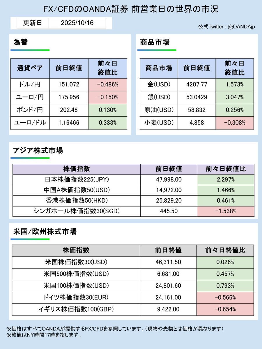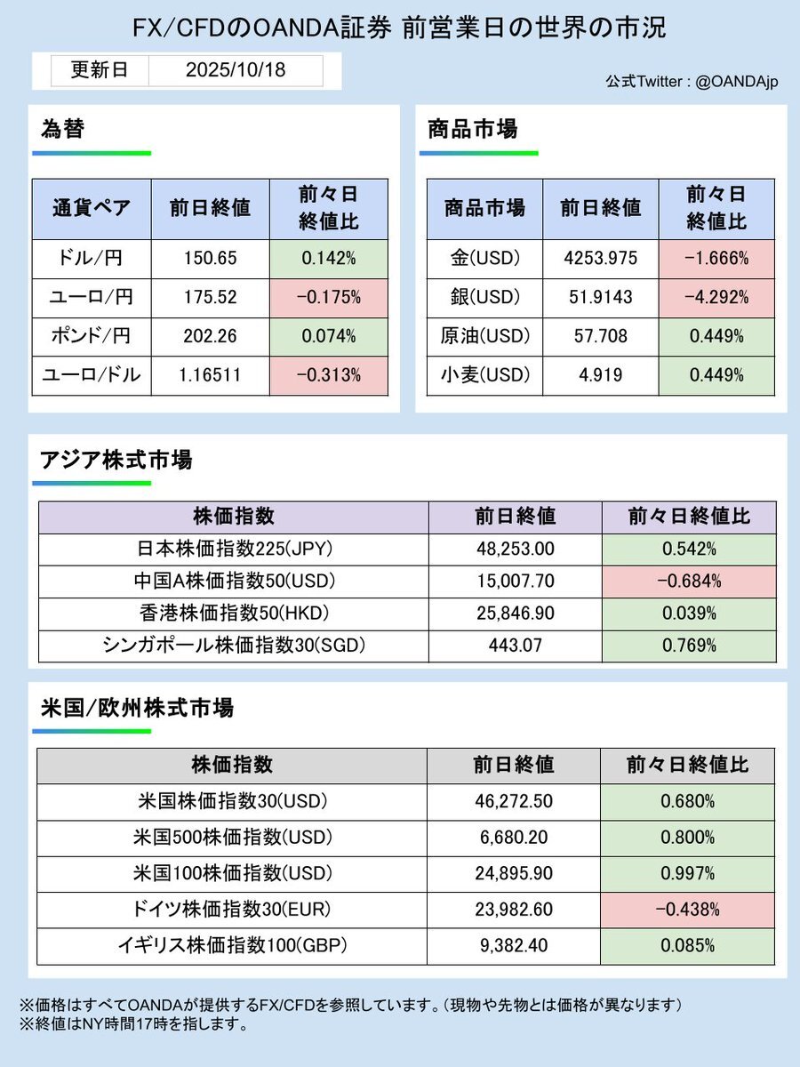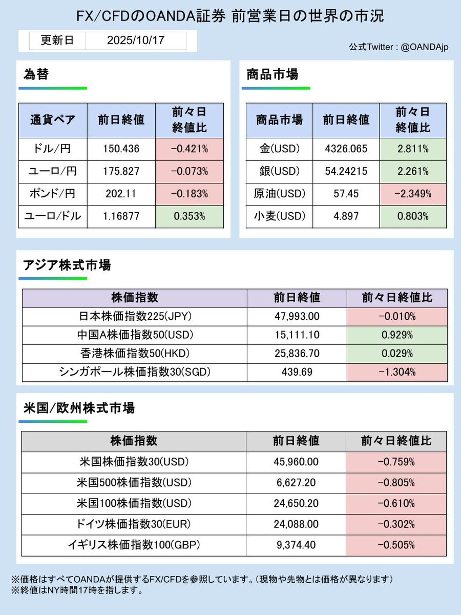 📈 2025年10月17日の主な経済指標 📉 18:00(EU)9月消費者物価指数(HICP) 21:30(米)9月住宅着工件数 22:15(米)9月鉱工業生産 #OANDA #FX #ドル円 #ユーロ #ゴールド #経済指標 #日経平均株価 #トランプ米大統領 #トランプ関税 #高市 #米雇用統計 #為替 #fx #資産運用 #市況 #CFD pic.x.com/ZFuxm77r6a