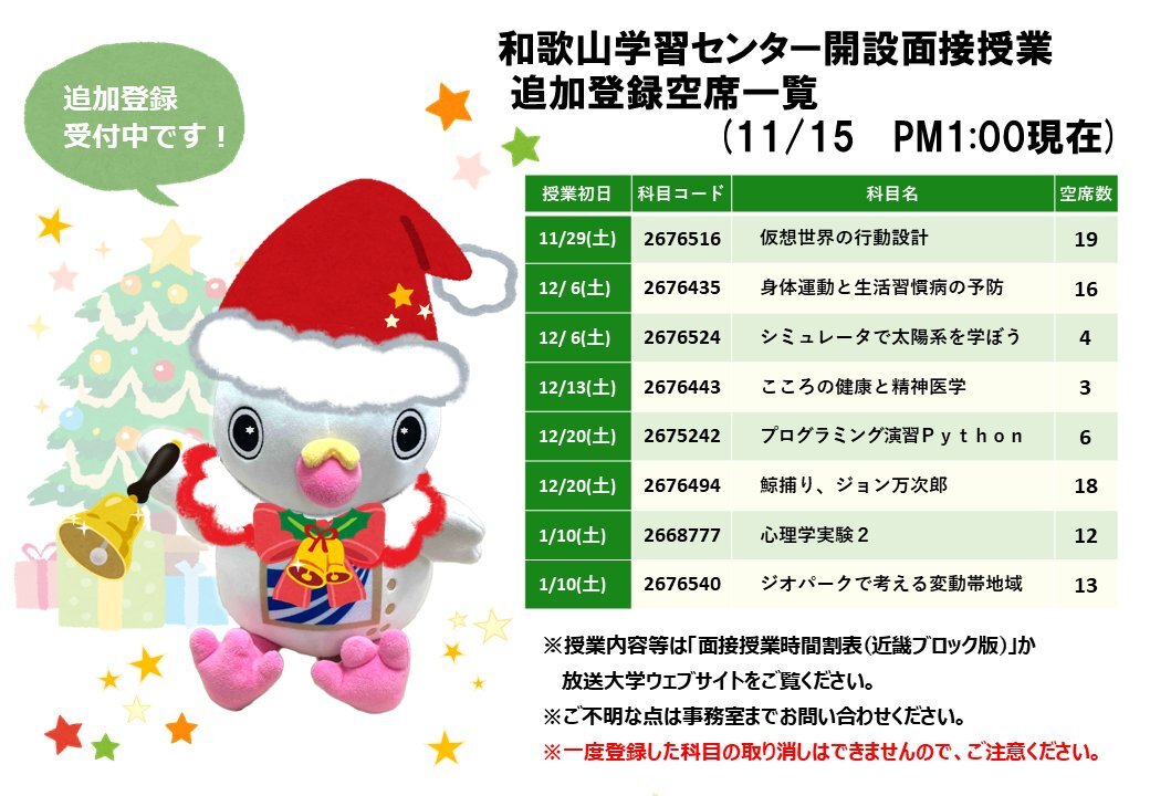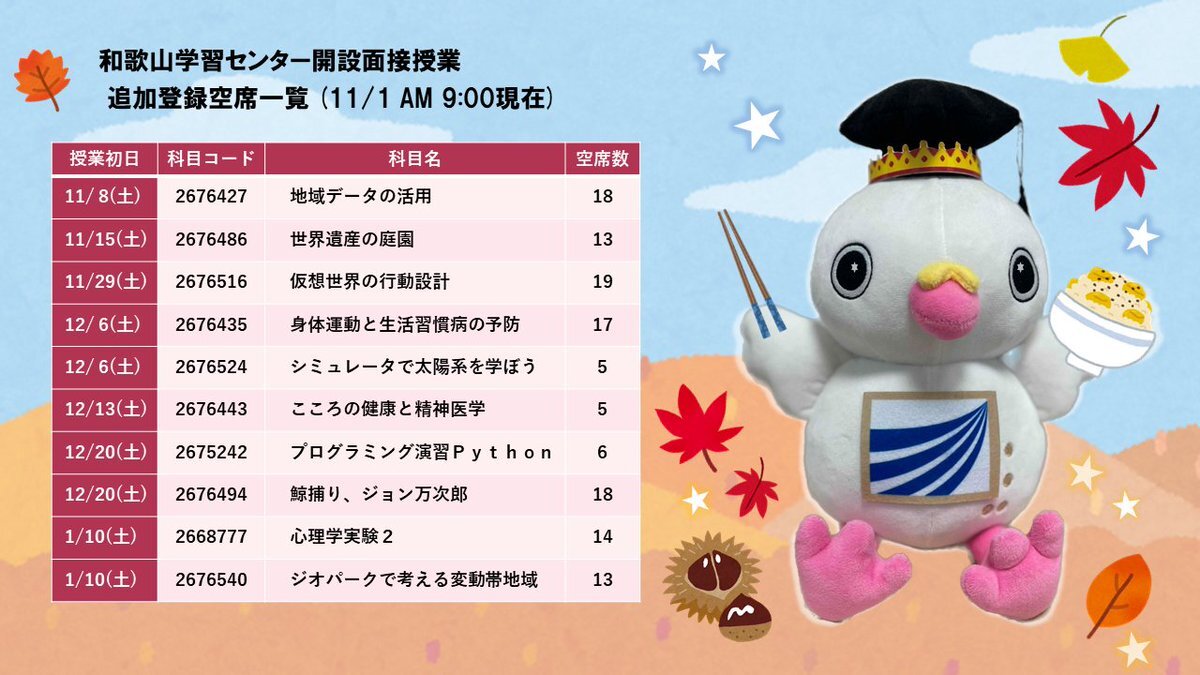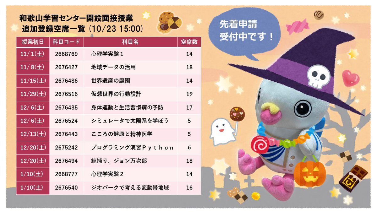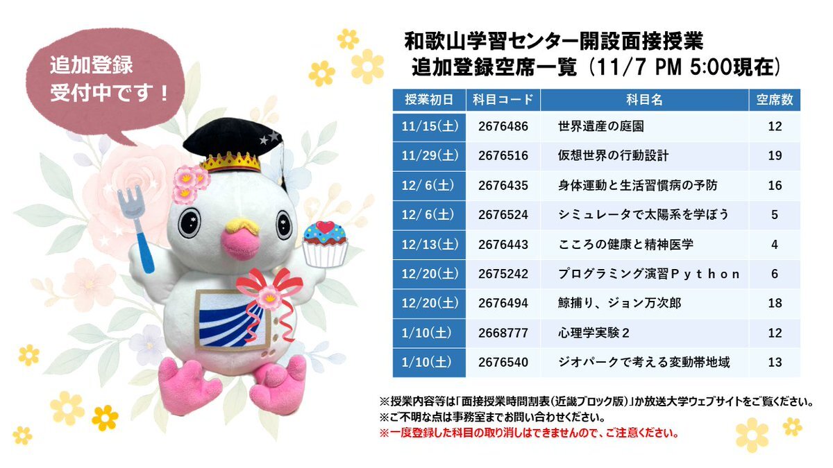 #放送大学 #和歌山学習センター #面接授業 #空席情報 (11/15 PM1:00現在) 以下の科目が追加登録可能です。 ぜひご登録ください! sc.ouj.ac.jp/center/wakayam… #心理学 #仮想世界 #生活習慣病 #太陽系 #精神医学 #python #ジョン万次郎 #ジオパーク pic.x.com/qc8MY3MDab