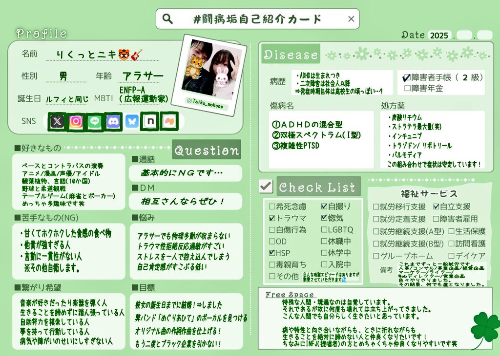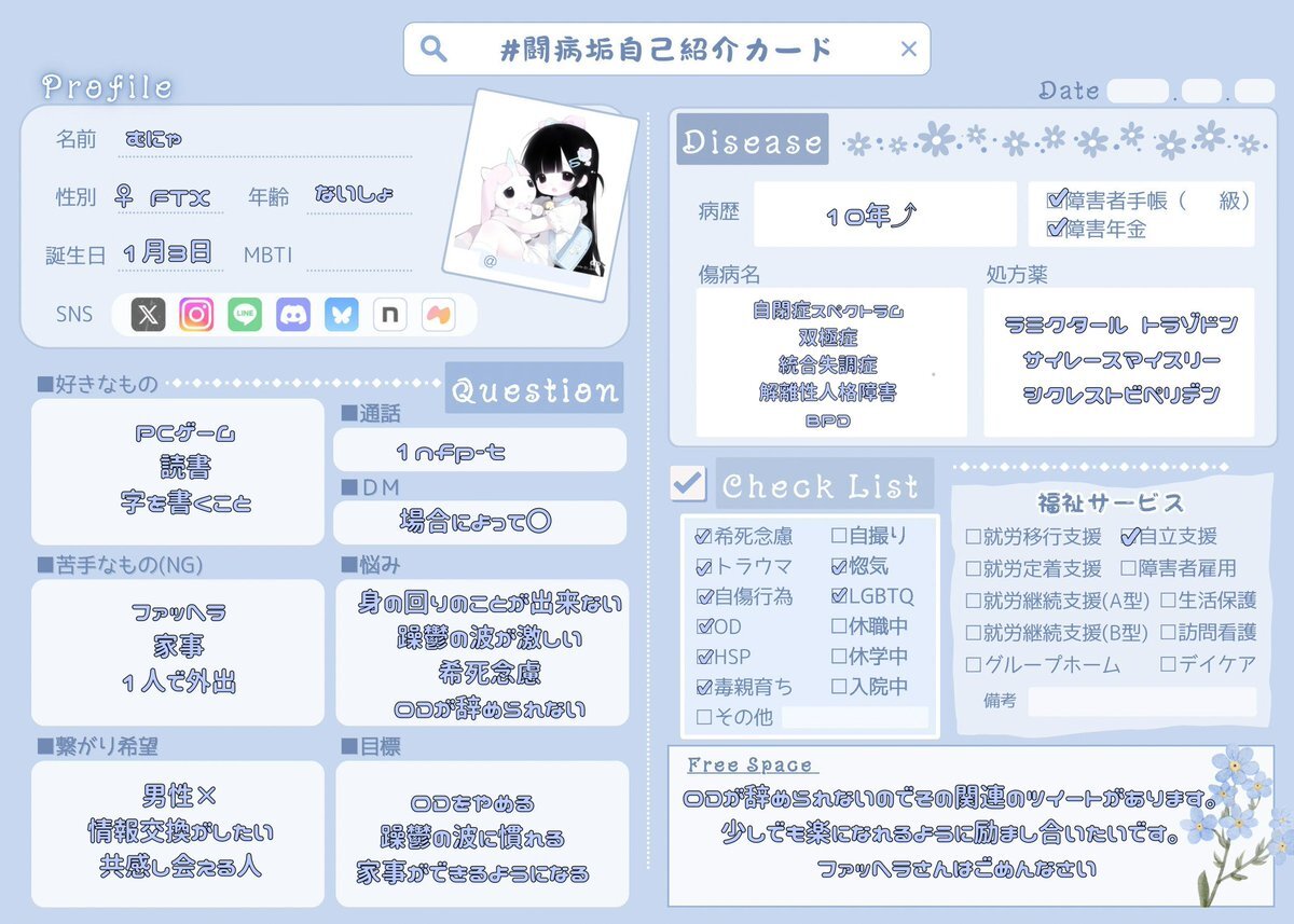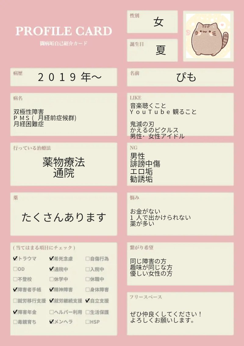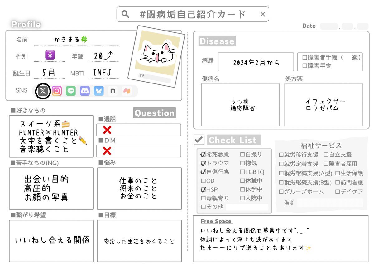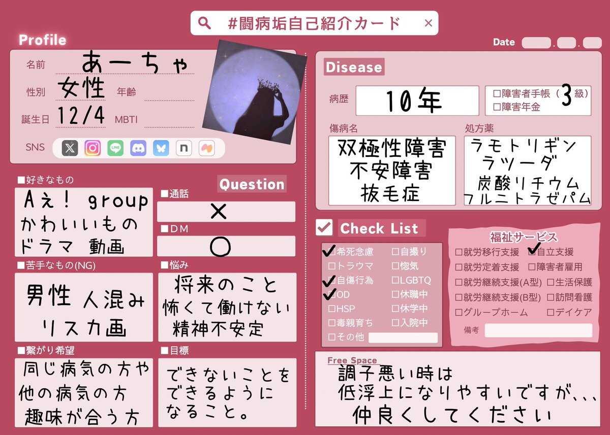 @0 🔗先より反応お願いします🙇♀️🍀 #闘病垢自己紹介カード #闘病垢さんと繋がりたい #精神疾患持ちのための自己紹介カード #精神疾患を持つ人と繋がりたい x.com/ai__jasmine/st…