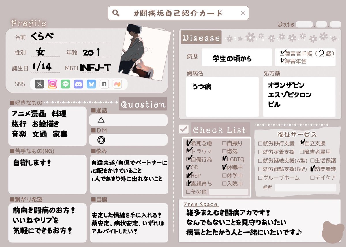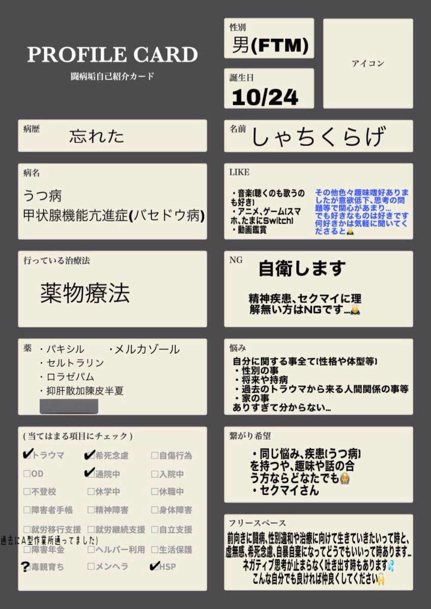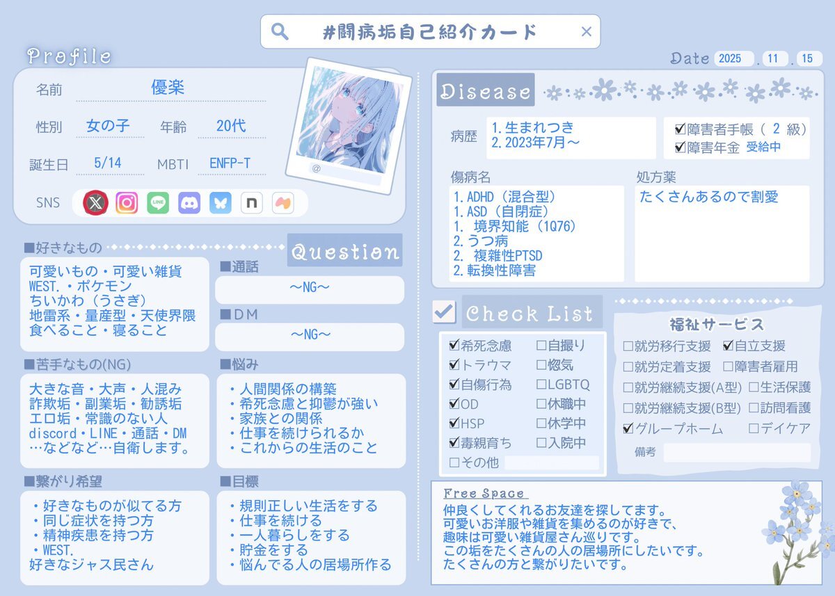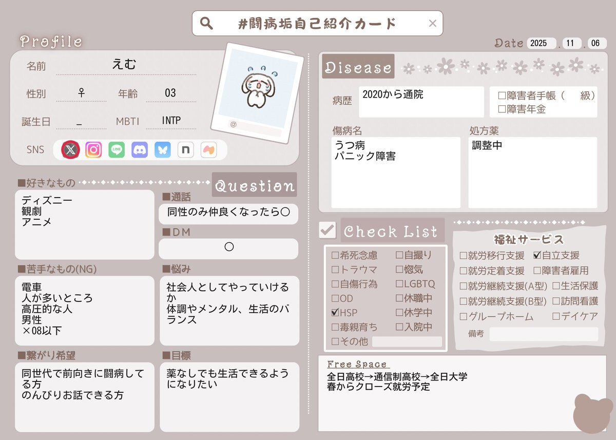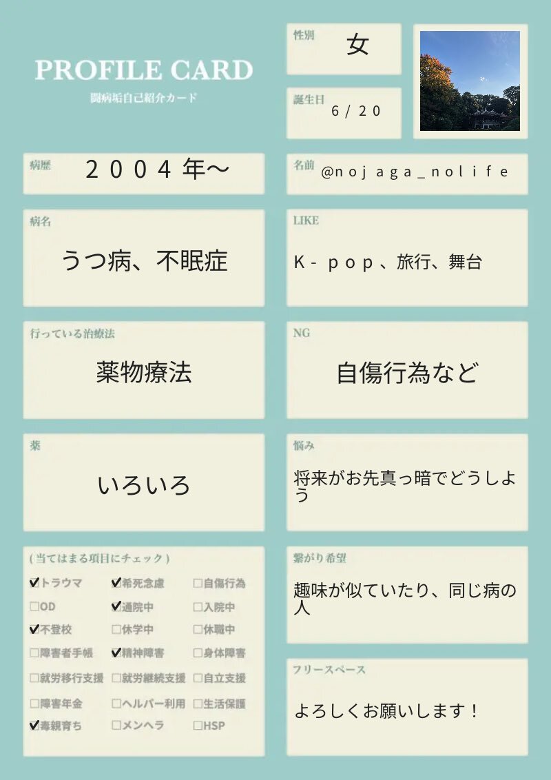 @0 🔗先より反応お願いします🙇♀️🍀 #闘病垢自己紹介カード #闘病垢さんと繋がりたい #精神疾患持ちのための自己紹介カード #精神疾患を持つ人と繋がりたい x.com/ai__jasmine/st…