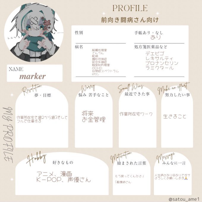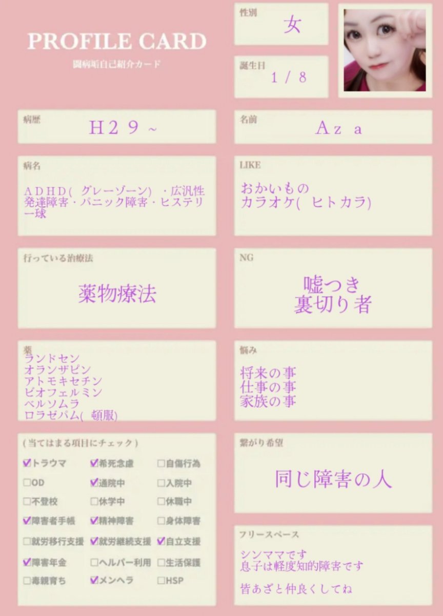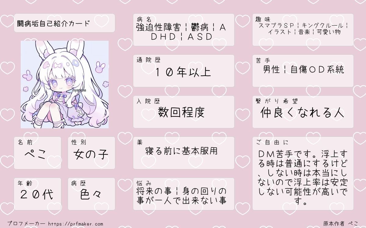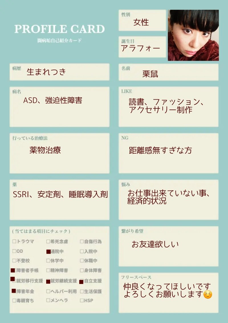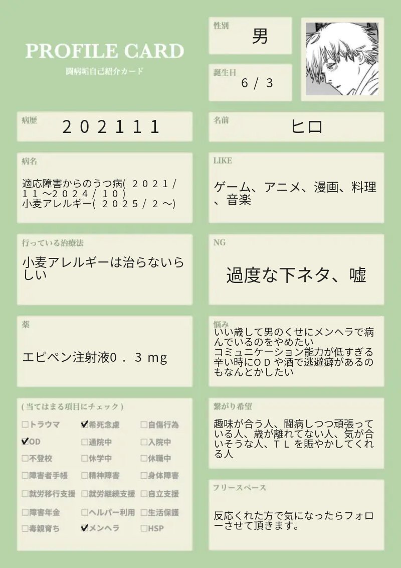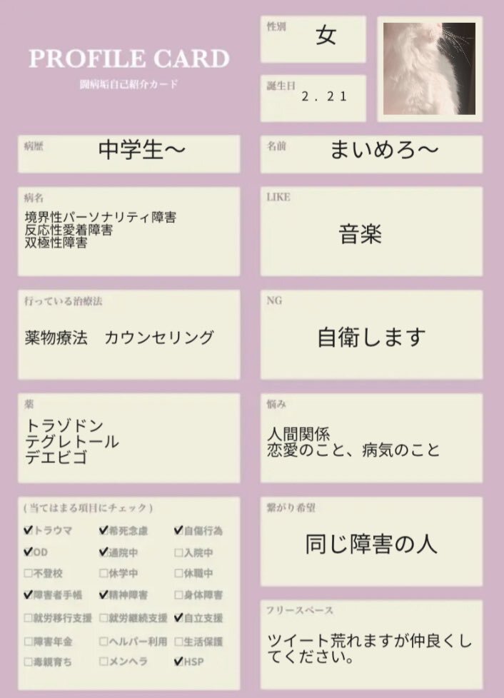 @0 🔗先より反応お願いします🙇♀️🍀 #闘病垢自己紹介カード #闘病垢さんと繋がりたい #精神疾患持ちのための自己紹介カード #精神疾患を持つ人と繋がりたい x.com/ai__jasmine/st…