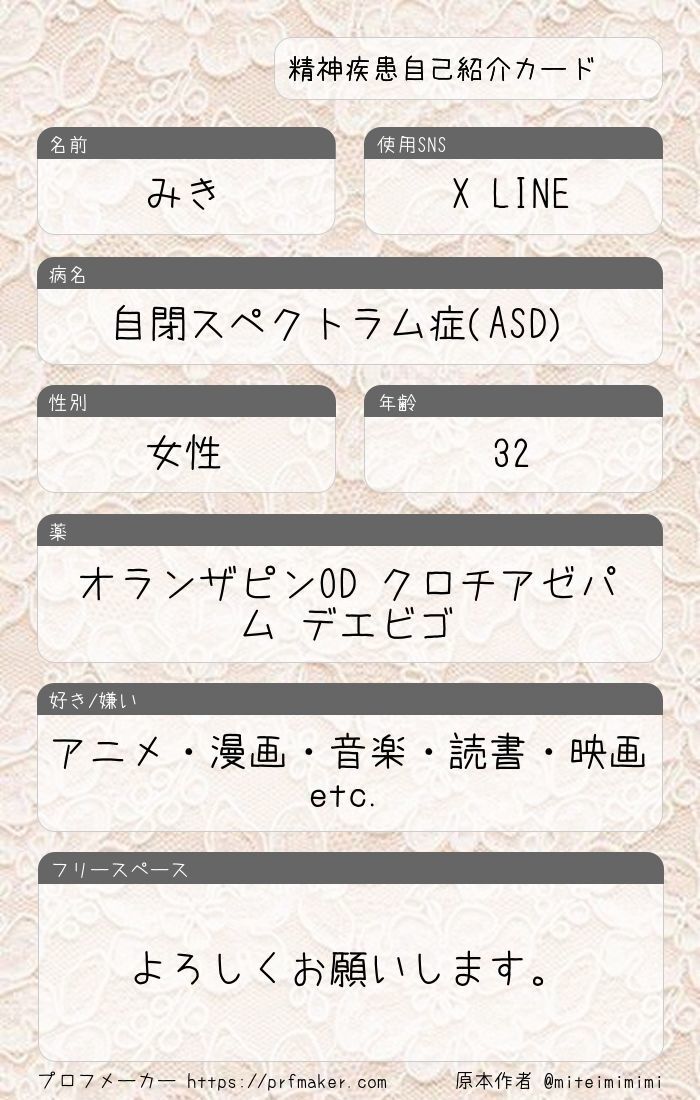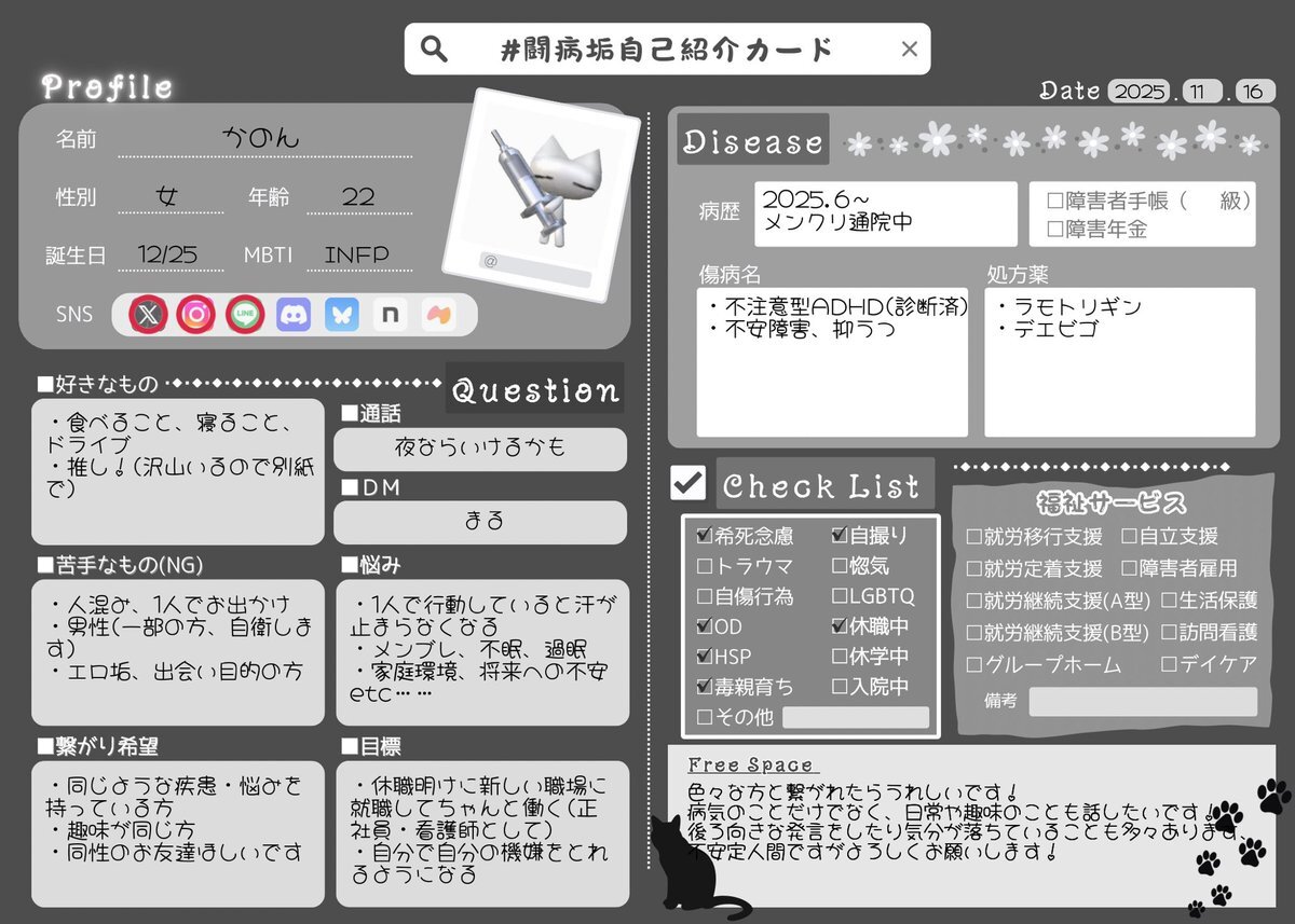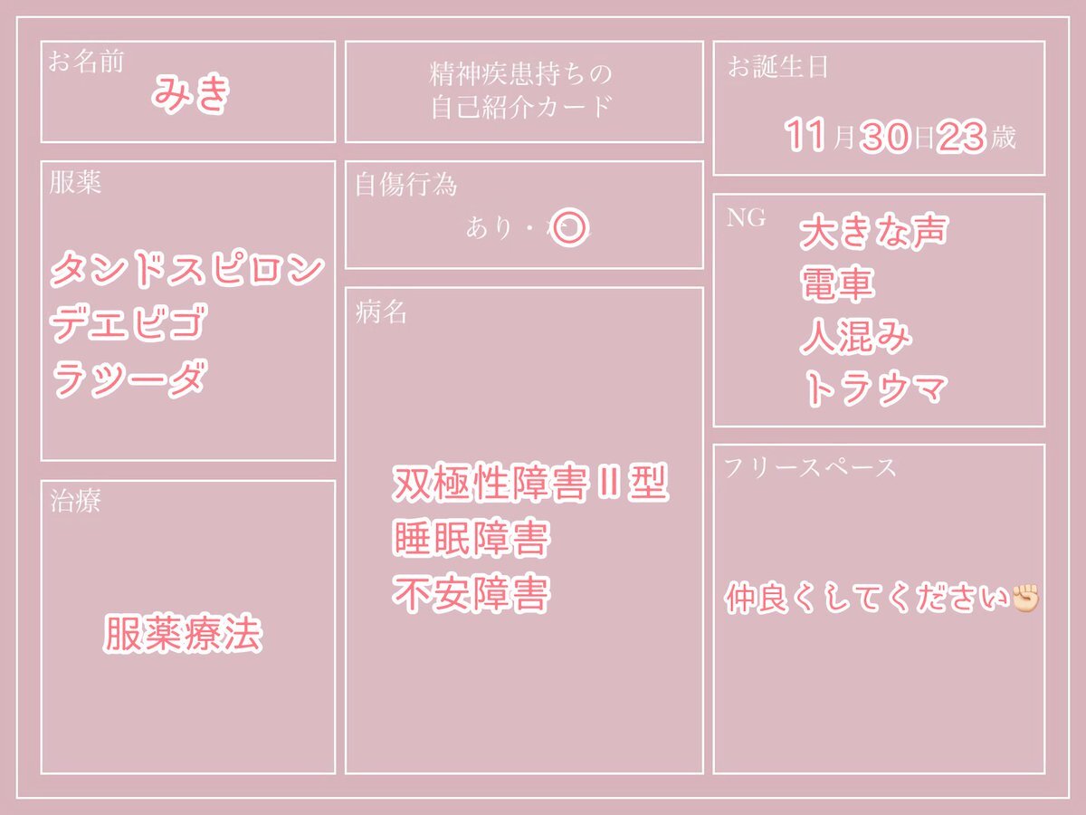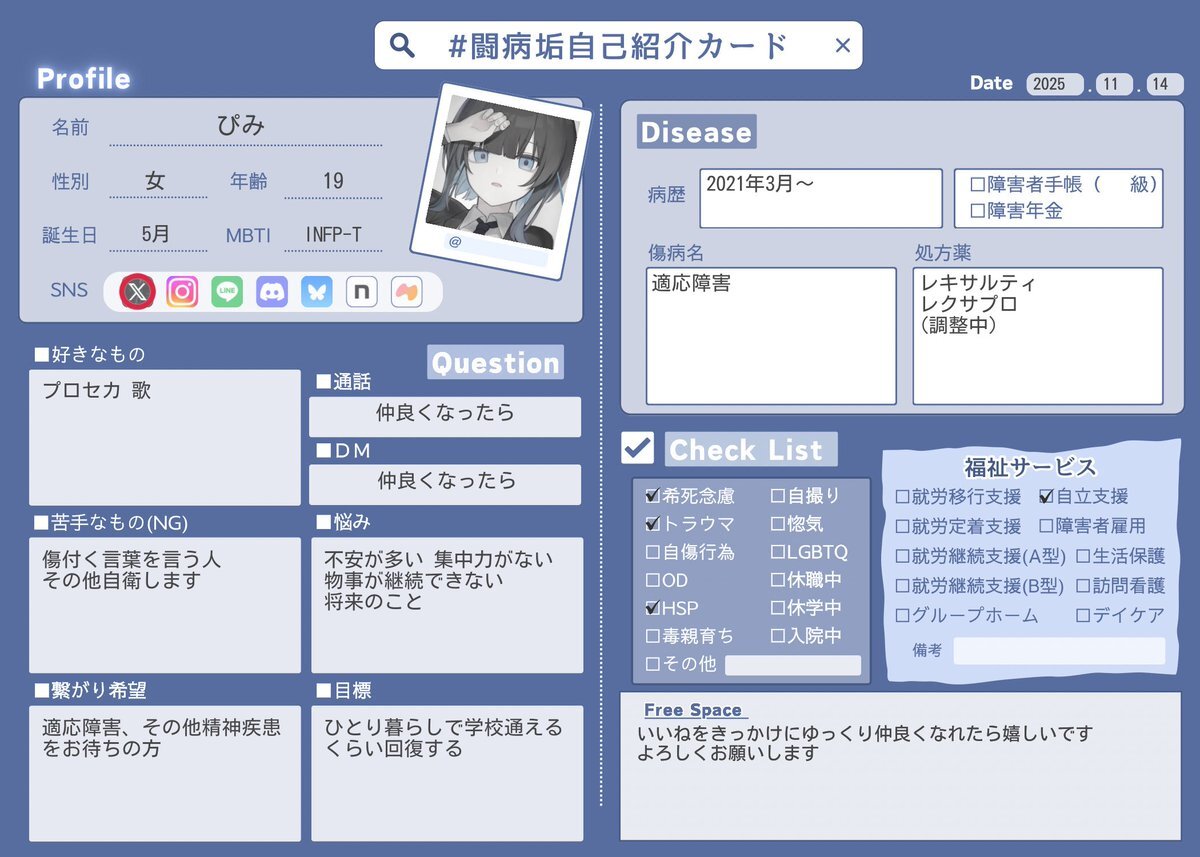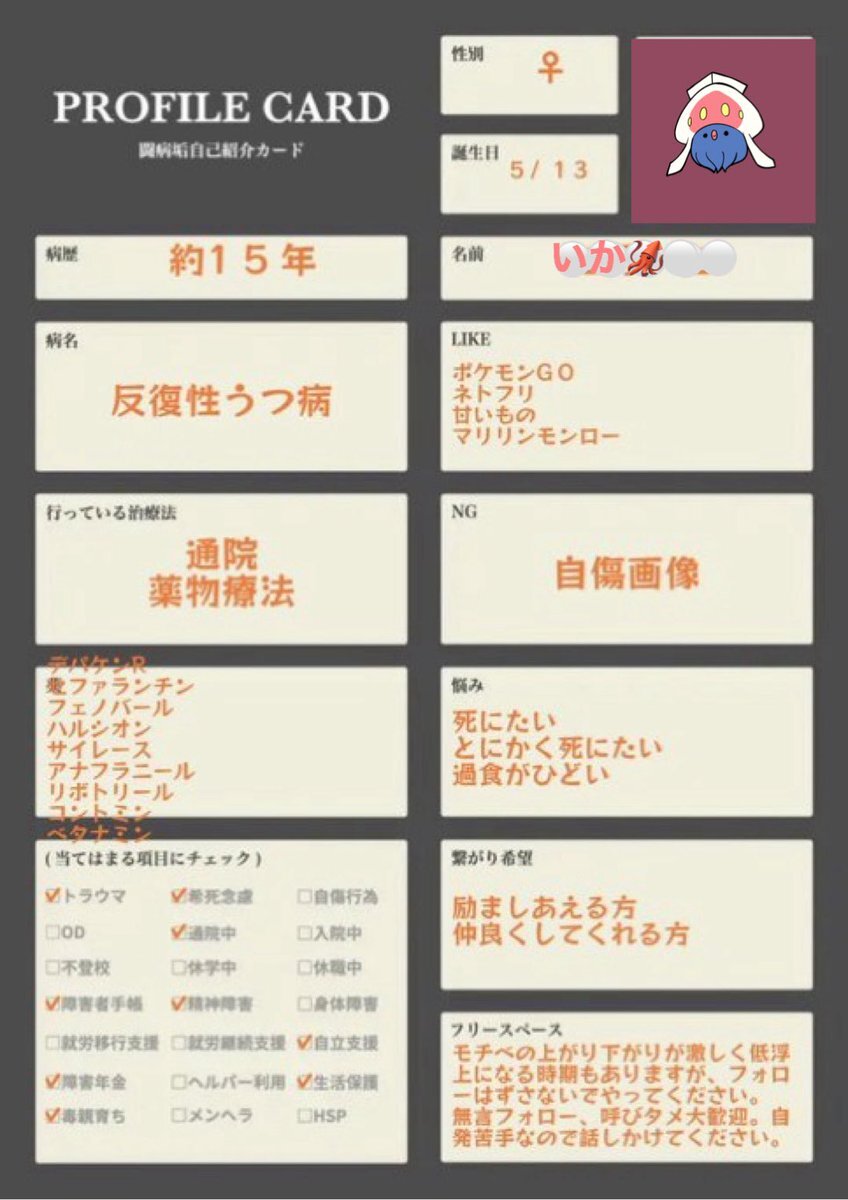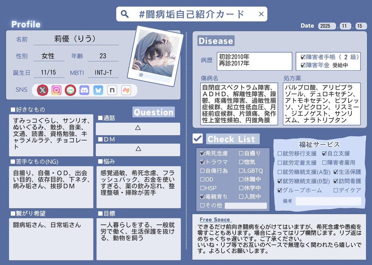 薬変わりました〜 闘病垢さんフォロバします #精神疾患を持つ人と繋がりたい #闘病垢 #精神疾患持ちのための自己紹介カード #闘病垢自己紹介カード #闘病垢さんと繋がりたい pic.x.com/TiEzBNe1xe