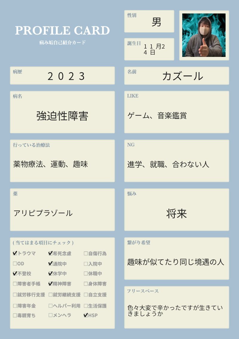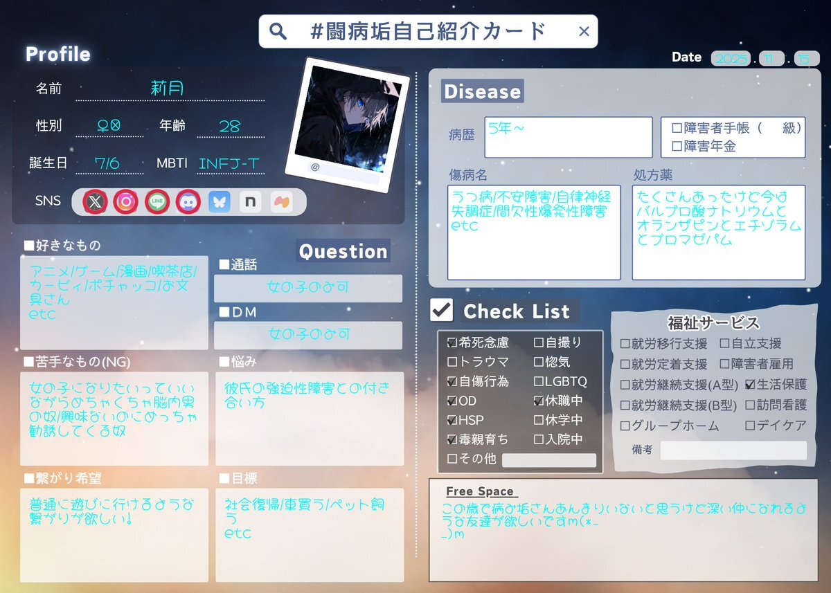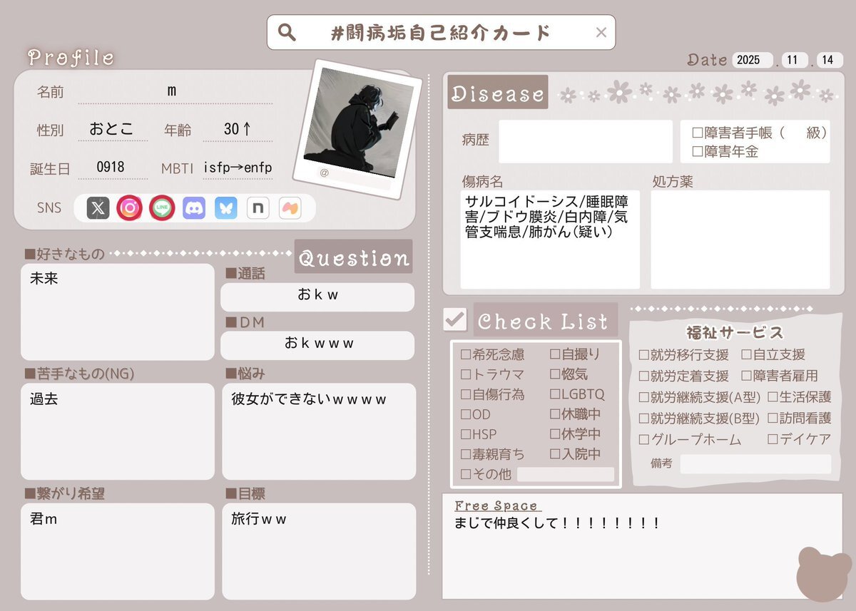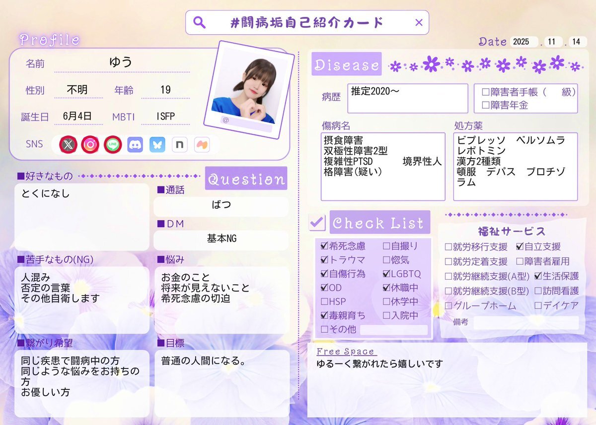 @a リプ、いいねで絡める方と繋がりたいです。 よろしくお願いします。 #闘病垢自己紹介カード #闘病垢さんと繋がりたい #精神疾患持ちのための自己紹介カード #精神疾患を持つ方と繋がりたい pic.x.com/OKhBMQULg5