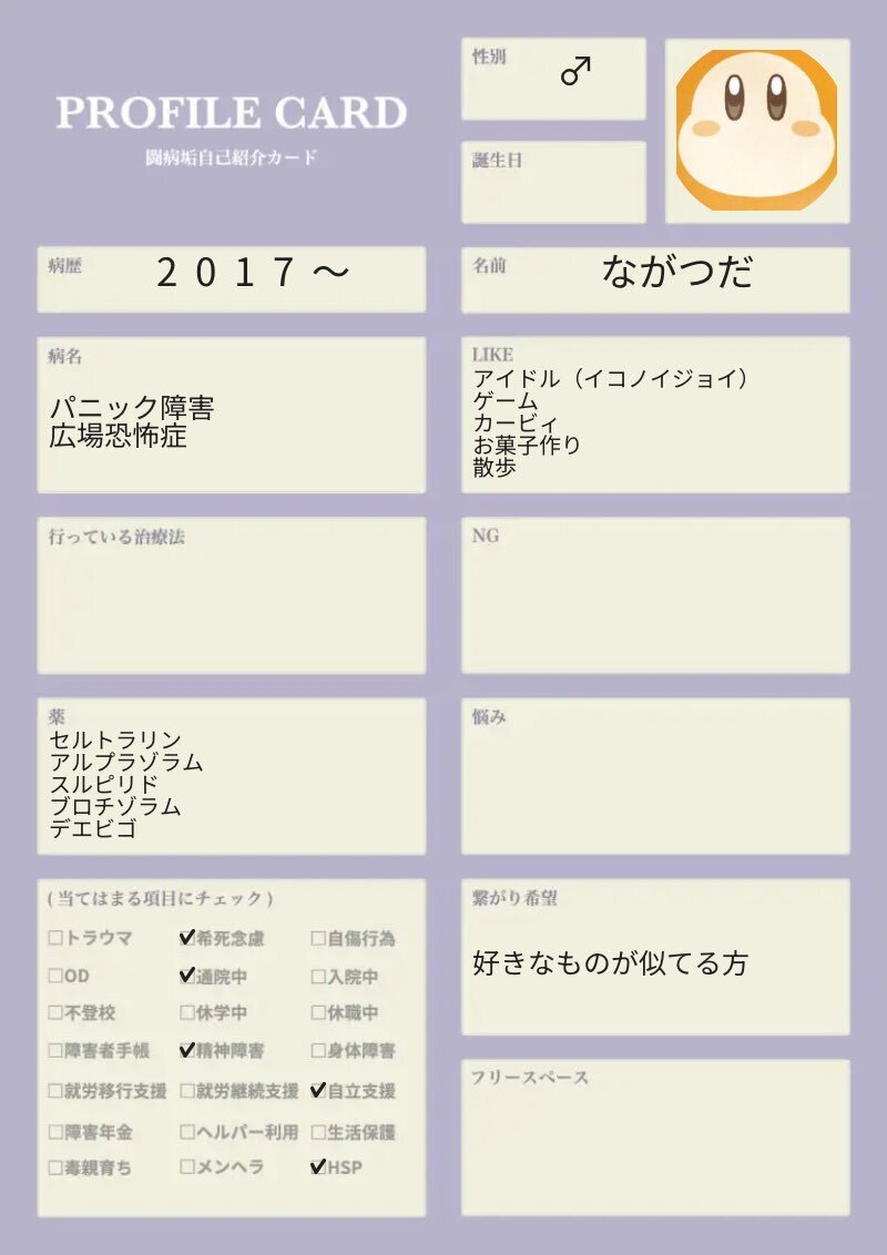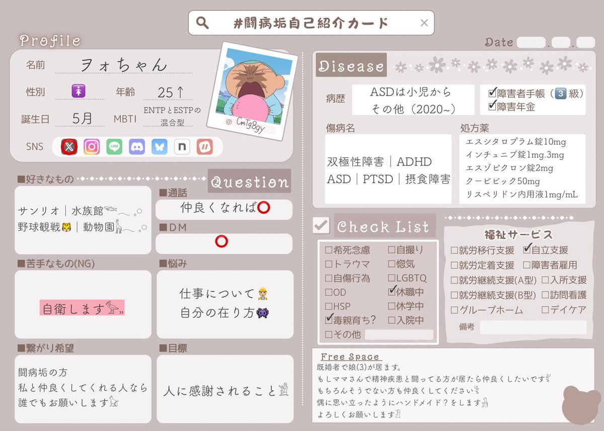🏷𓈒𓏸︎︎︎︎ 作り直しました👍🏻⭐️ 気軽に反応してもらえたらうれしいです🐥 #闘病垢自己紹介カード #闘病垢さんと繋がりたい #精神疾患を持つ人と繋がりたい #精神疾患を持つ方と繋がりたい #精神疾患持ちのための自己紹介カード pic.x.com/8mIKHW067u