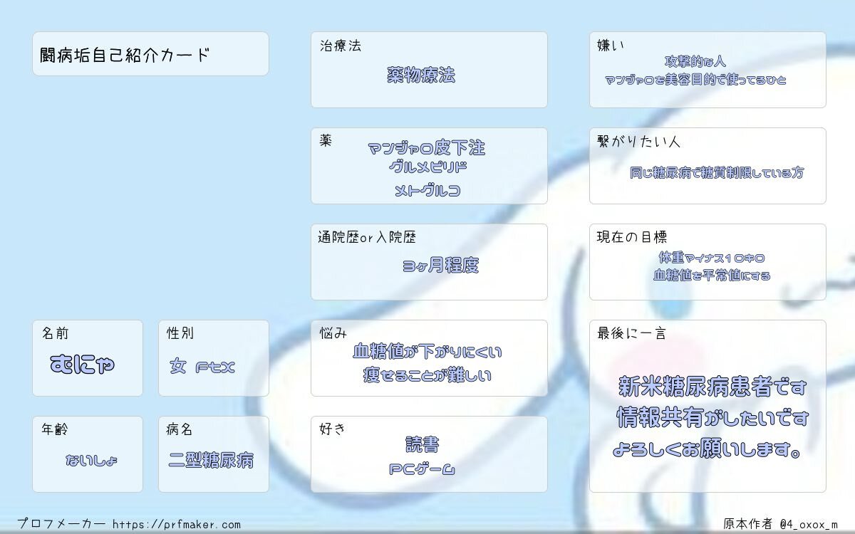 🏷️ ㆍ精神疾患と糖尿病を患っています.ᐟ.ᐟ ㆍ同じ病気の方と仲良くしたいです。 ㆍいいねお迎え行きます.ᐟ.ᐟ #闘病垢自己紹介カード #闘病垢さんと繋がりたい #糖尿病 #精神疾患を持つ人と繋がりたい #精神疾患持ちのための自己紹介カード #日常垢 pic.x.com/auwdcELjHD