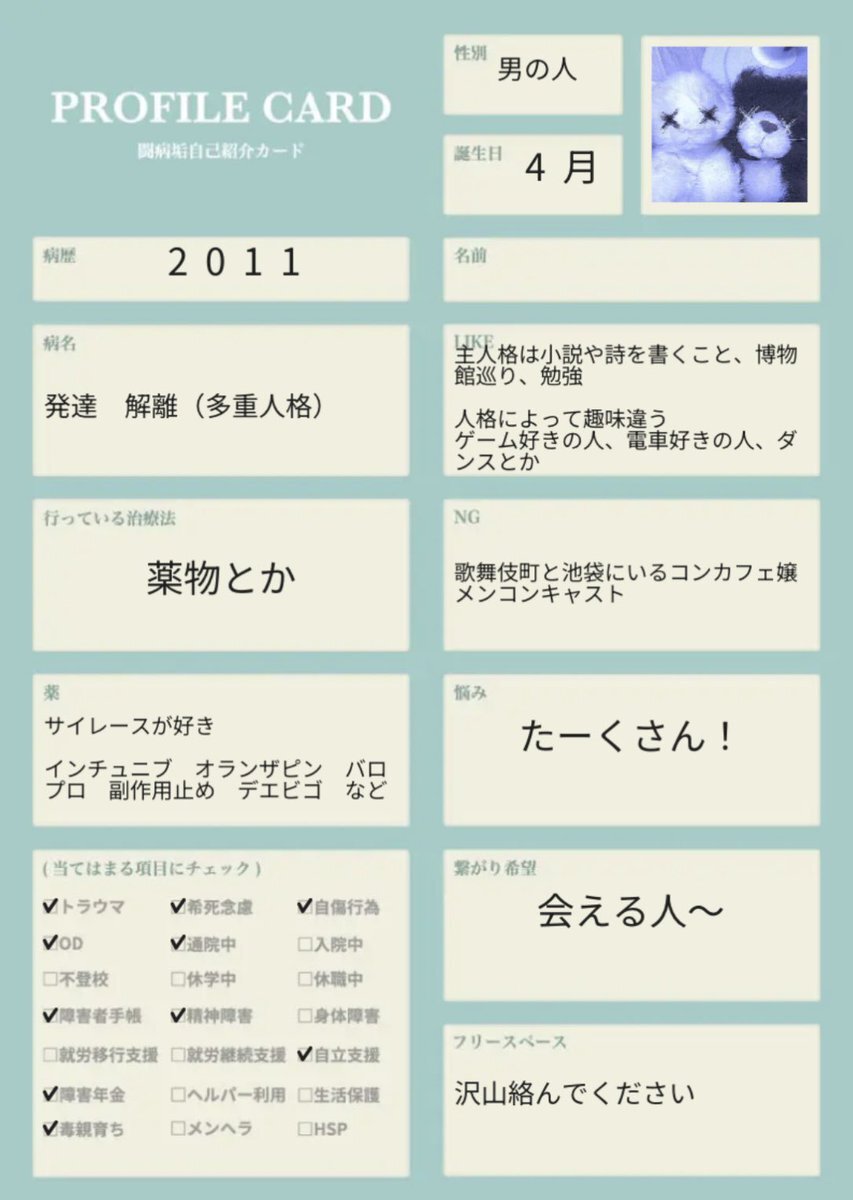. 頑張って生きてます! お友達ください! . #闘病垢自己紹介カード #闘病垢さんと繋がりたい #精神疾患持ちのための自己紹介カード #精神疾患を持つ人と繋がりたい #精神疾患を持つ方と繋がりたい #解離性障害 #解離性同一性障害 pic.x.com/vqwfKCfL4J