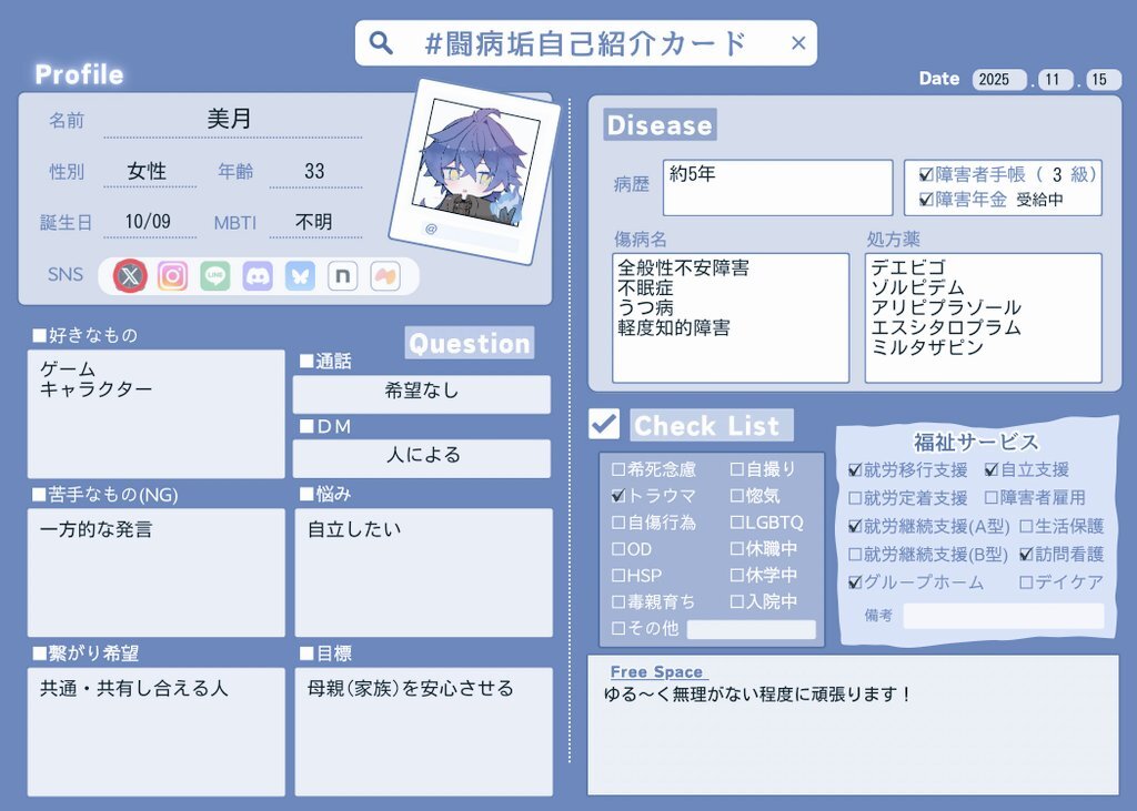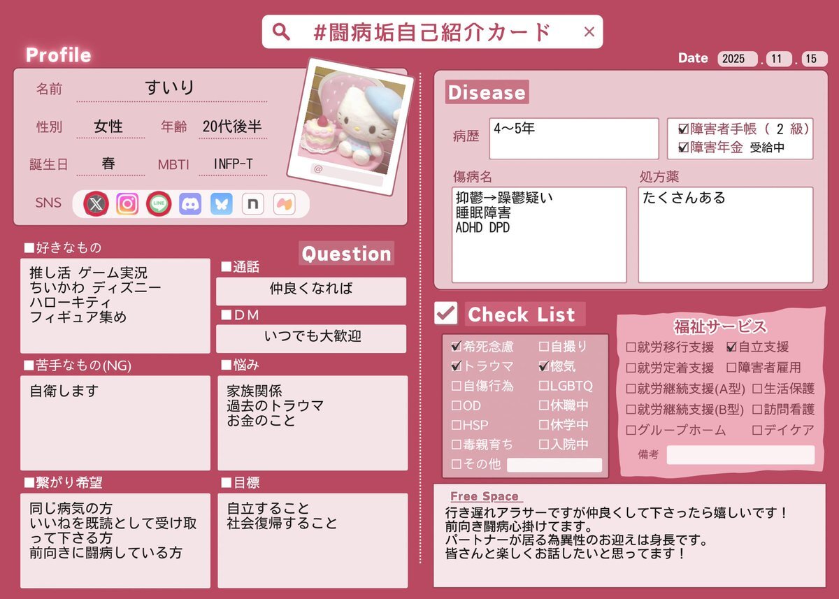 🔗先からお迎えします^. ̫.^ #精神疾患持ちのための自己紹介カード #闘病垢さんと繋がりたい #闘病垢自己紹介カード #精神疾患を持つ人と繋がりたい #日常垢さんとつながりたい x.com/yqByG6QdcW2101…