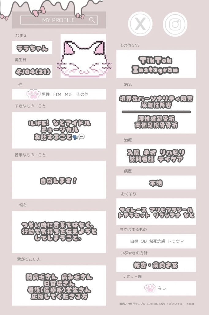 ︎︎ #精神疾患を持つ人と繋がりたい #精神疾患持ちのための自己紹介カード #闘病垢さんと繋がりたい #病み垢さんと繋がりたい #病み垢女子さんと繋がりたい #病み垢男子さんと繋がりたい #メンヘラさんと繋がりたい #BPD #病み垢 ︎︎ +👤RT♥️で気になる方お迎えꕀ🎀꒷꒦⸝⸝⸝ ︎︎