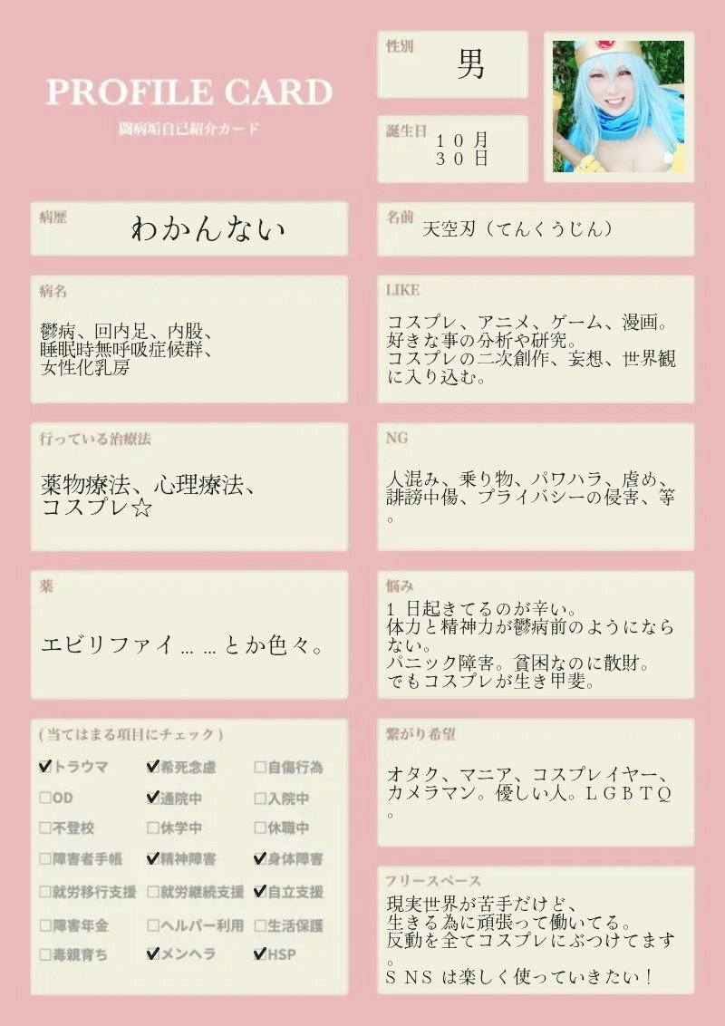 躁鬱コスプレイヤー💊 仕事と家の往復、体調不良が多い。 モンスターと一緒🪽💕 コスプレが生き甲斐⭐️ 悪意や誹謗中傷が苦手… よかったら仲良くしてください🏥 #精神疾患持ちのための自己紹介カード #闘病垢自己紹介カード #レイヤープロフ帳 #天空刃コスプレ #コスプレイヤーさんと繋がりたい ᅠ pic.x.com/1QNt5P82kn