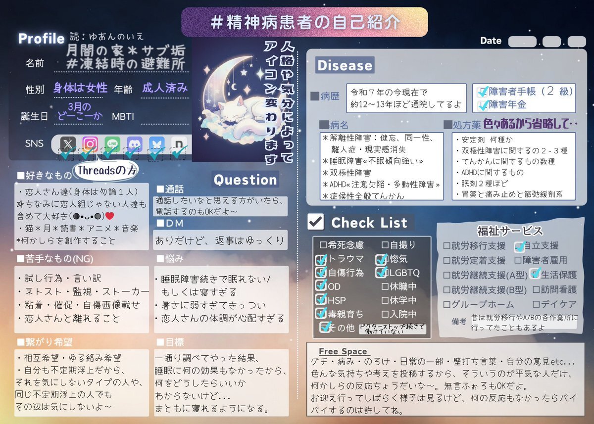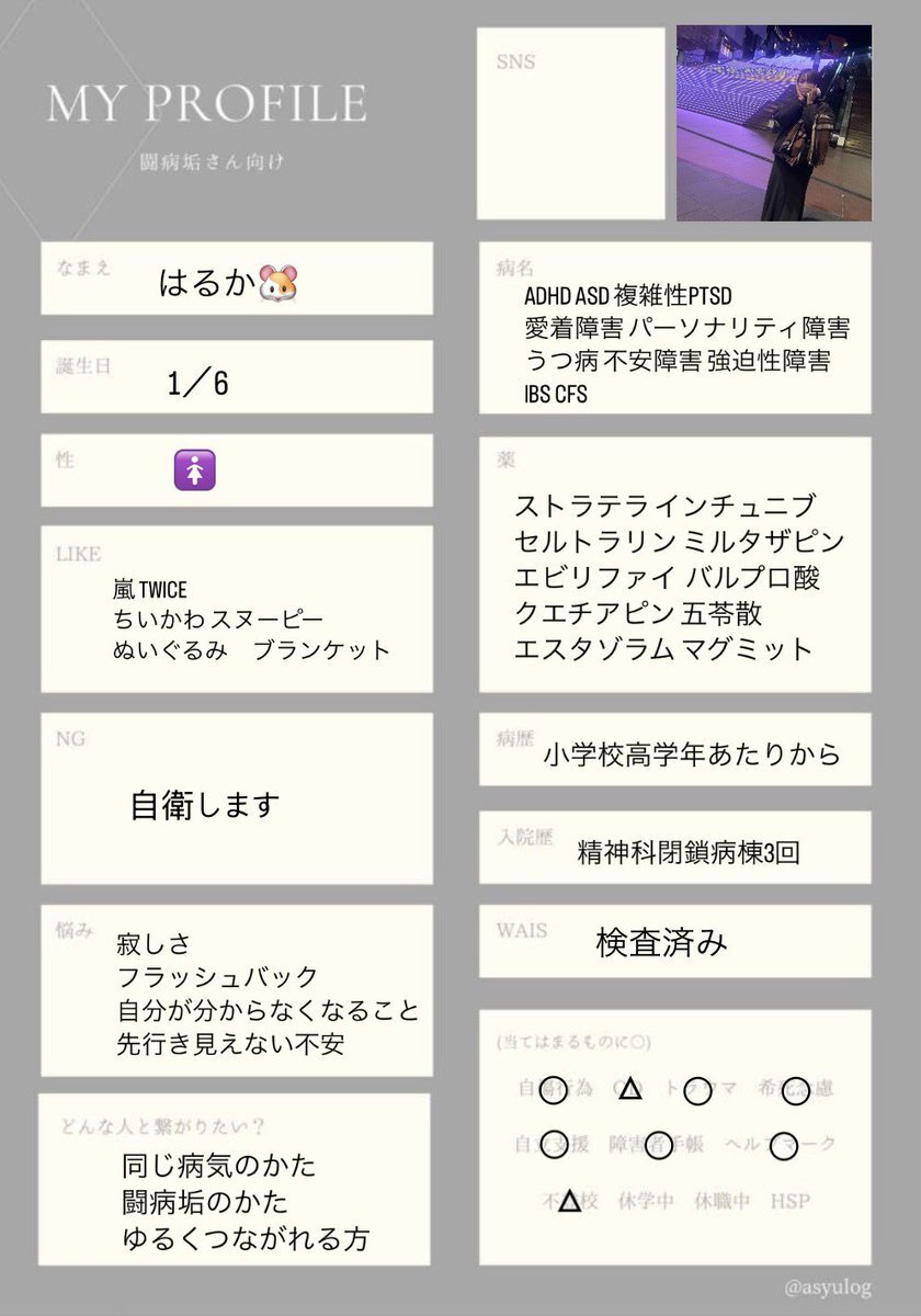 作り直しました😊 ゆるく繋がれたらな見守りあえたらなって思ってます𓈒◌𓐍𓈒°𓈒◌𓐍𓈒 #闘病垢 #精神疾患 #精神疾患持つ人と繋がりたい #精神疾患持ちのための自己紹介カード pic.x.com/mVEziVPsjc