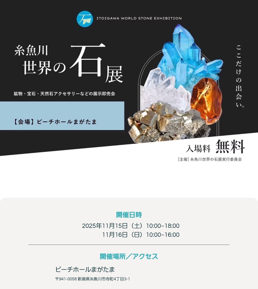 おはようございます⛅ 糸魚川は快晴☀️ 気温、13度 波、0.5mm 第3回 #糸魚川世界の石展2025 #ビーチホールまがたま 最終日が始まります 本日は4時まで 最後まで宜しくお願い致します😇 #糸魚川世界の石展 #糸魚川ショー pic.x.com/azCJ9YwVT8
